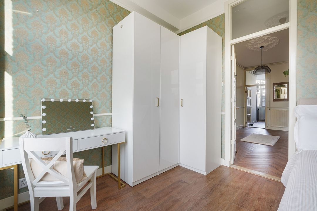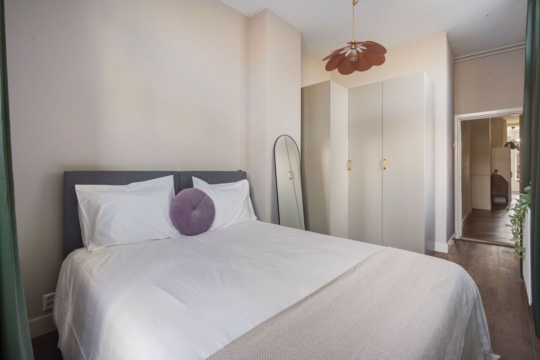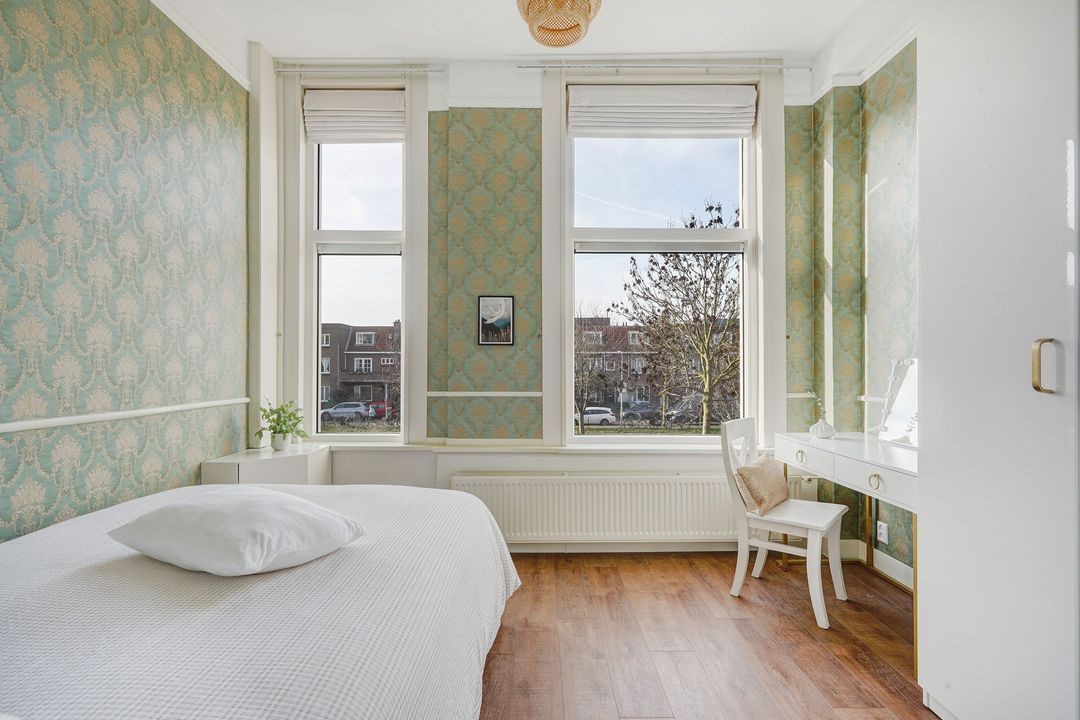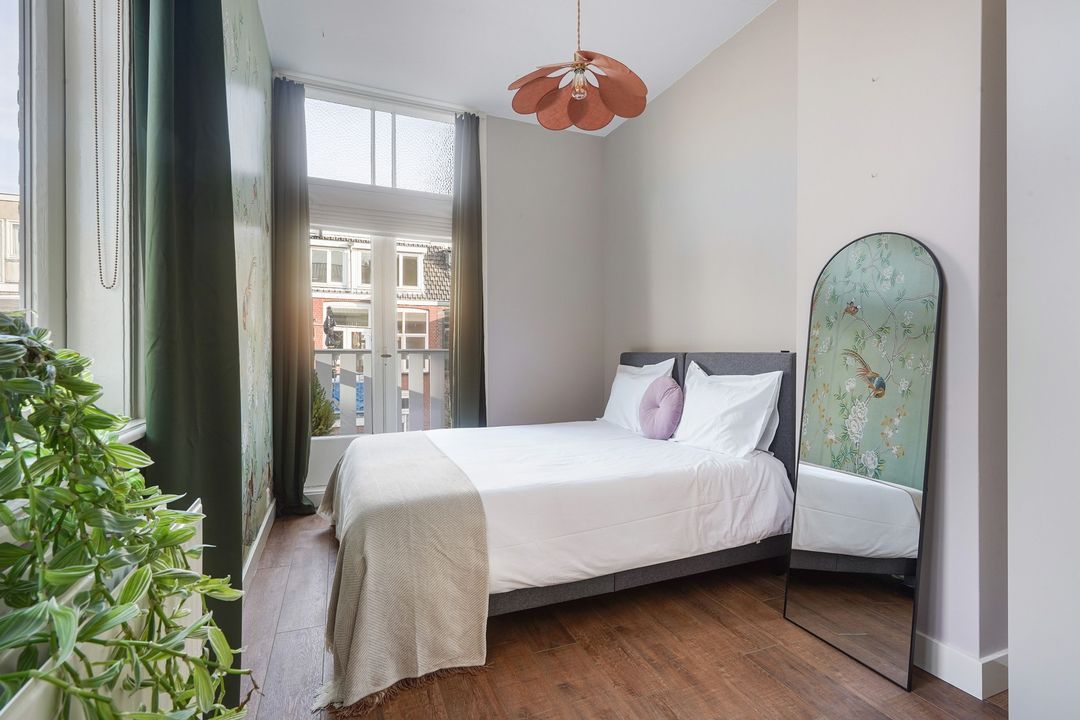 Lichte voorslaapkamer en een ruime achterslaapkamer met zijraam en openslaande deuren naar het 2e achterbalkon, gelegen op het noordwesten.