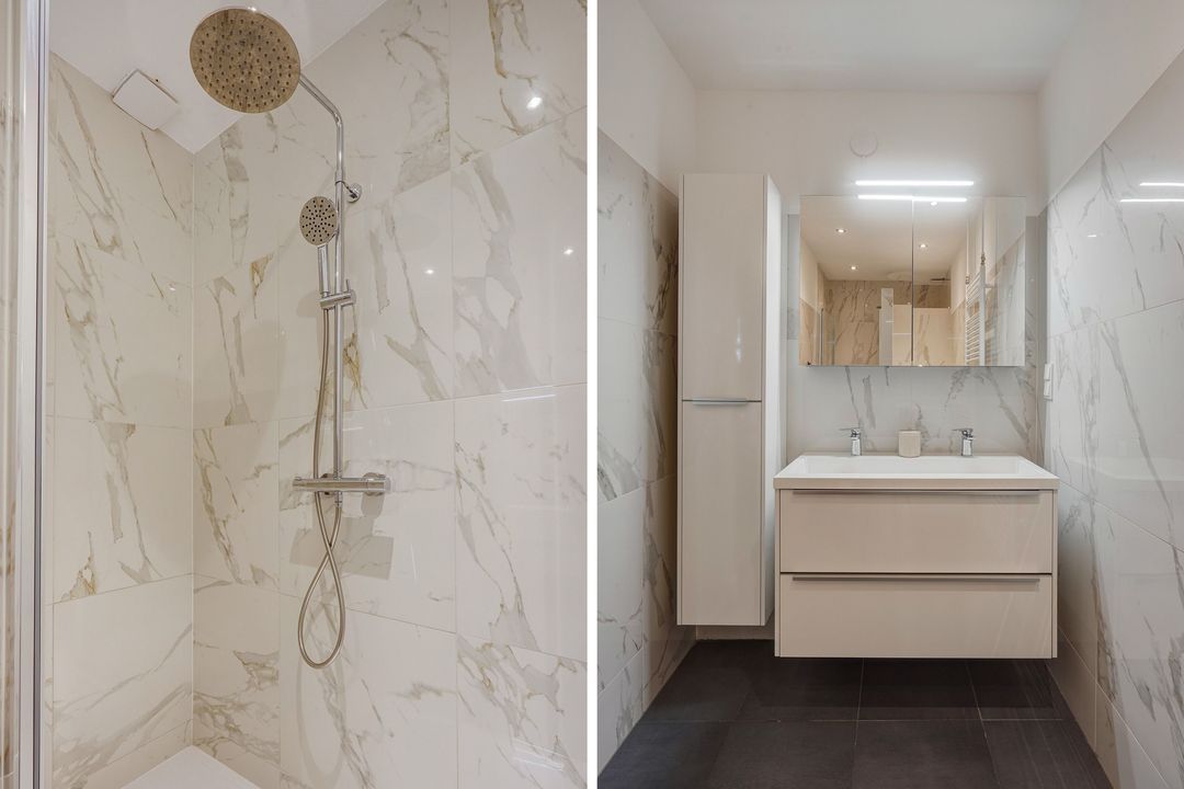 Via ruim open portiek de entree van het appartement op de 1e verdieping. Ruime centrale hal met toegang tot alle vertrekken, meterkast, vaste kast en een separaat ruim modern toilet. Ruime nieuwe fraai betegelde badkamer voorzien van inloop(regen)douche, dubbel wastafelmeubel, spiegelkast, badkamermeubel, designradiator en aansluitingen voor wasmachine en droger.
