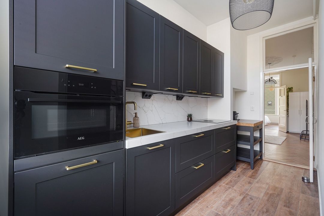 The bright living/dining room, approximately 44 m², features beautiful original doors with deep sand-etched glass, finished in two luxurious Art Nouveau/Art Deco motifs, separating the living and dining areas. The living/dining room also features a heavy, high-quality PVC herringbone floor, high ceilings with original ornamentation, two antique fireplaces, unobstructed views to the front, and French doors from the back room provide access to the first rear balcony, facing northeast and equipped with an awning. The modern, 1.5-year-old closed kitchen features a BORA induction cooktop with integrated extractor hood, integrated appliances including a combination oven and dishwasher (AEG), a separate fridge/freezer, and the central heating boiler.