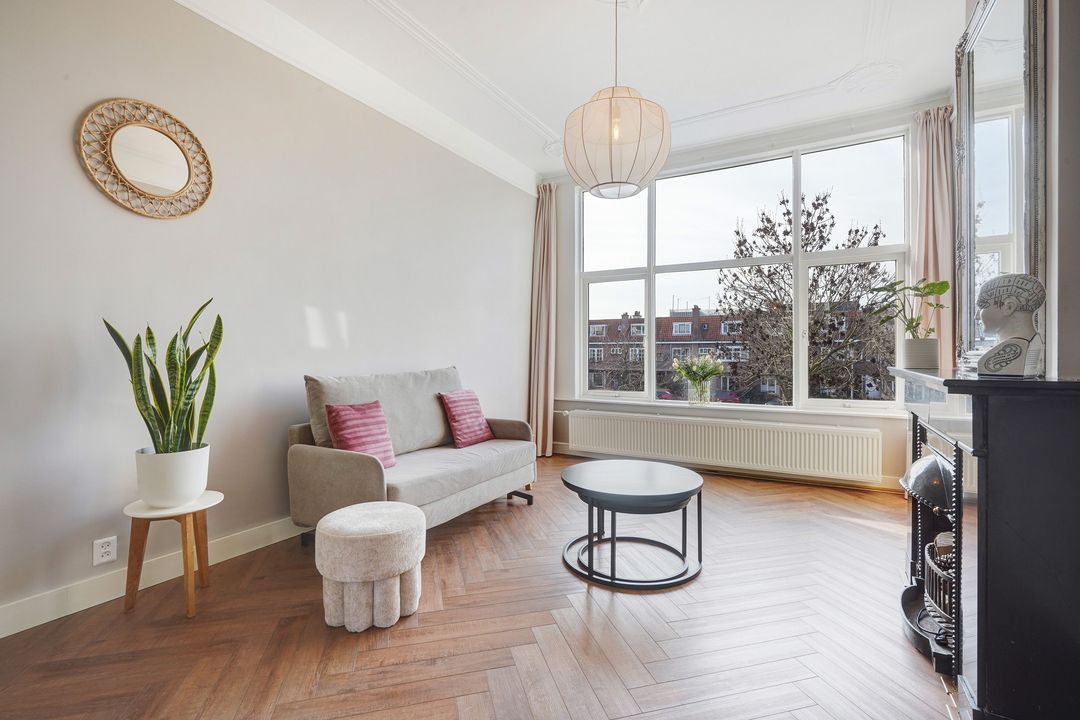Lichte woon/eetkamer van cira 44 m2 voorzien van prachtige originele suite deuren met diep zand geëtst glas, uitgevoerd in twee luxueuze Art Nouveau/Art Deco motieven, waarmee u de living en eetkamer kunt scheiden. Verder is de woon/eetkamer voorzien van een zware kwaliteit PVC-vloer in visgraatmotief, hoge plafonds met de originele ornamenten, 2 antieke schouwen, vrij uitzicht aan de voorzijde en via de achterkamer middels openslaande deuren toegang tot het 1e achterbalkon, gelegen op het noordoosten, voorzien van een markies.