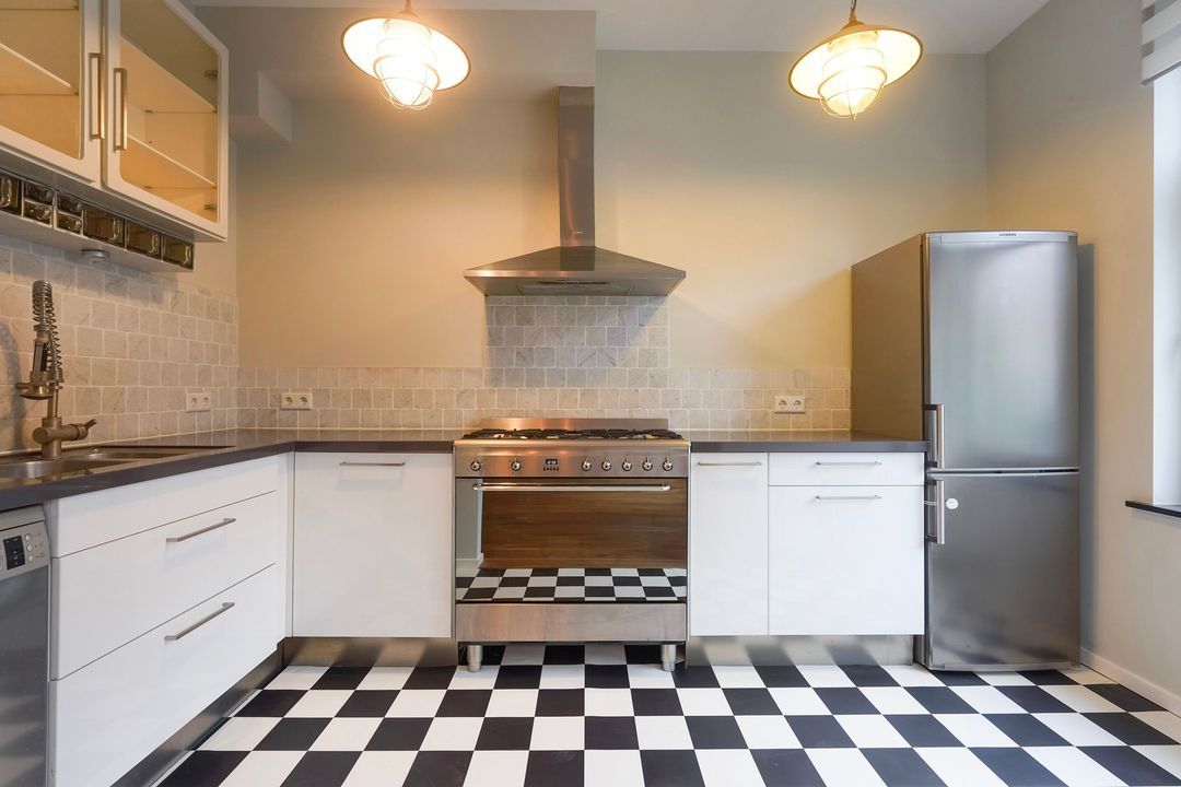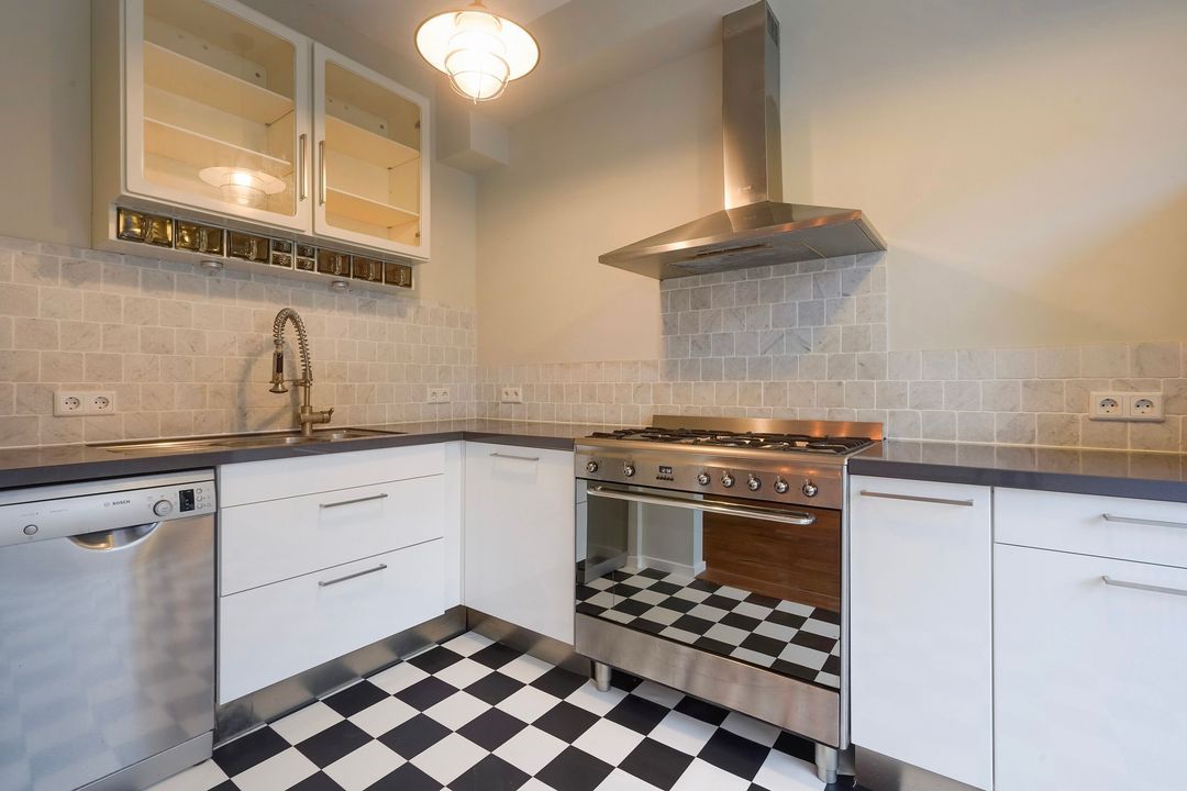 Woonkamer en suite met schuifseparatie met glas in lood deuren, 4 vaste kasten, houten vloer en een half open keuken aan de voorzijde in L-opstelling voorzien van 5-pits gasfornuis met grote oven, afzuigkap, dubbele spoelbak, koel/vriescombinatie en vaatwasser.