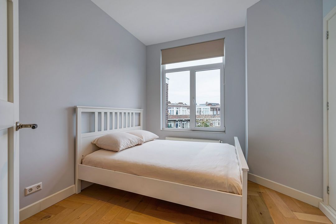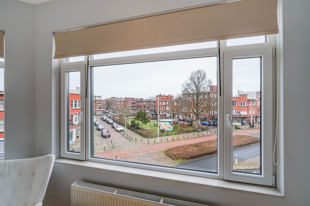 Ruime achterslaapkamer met vaste kast, tussengelegen kamer met deur naar zonnig achterbalkon, gelegen op het zuiden, en een 3e achterkamer met een vaste kast.