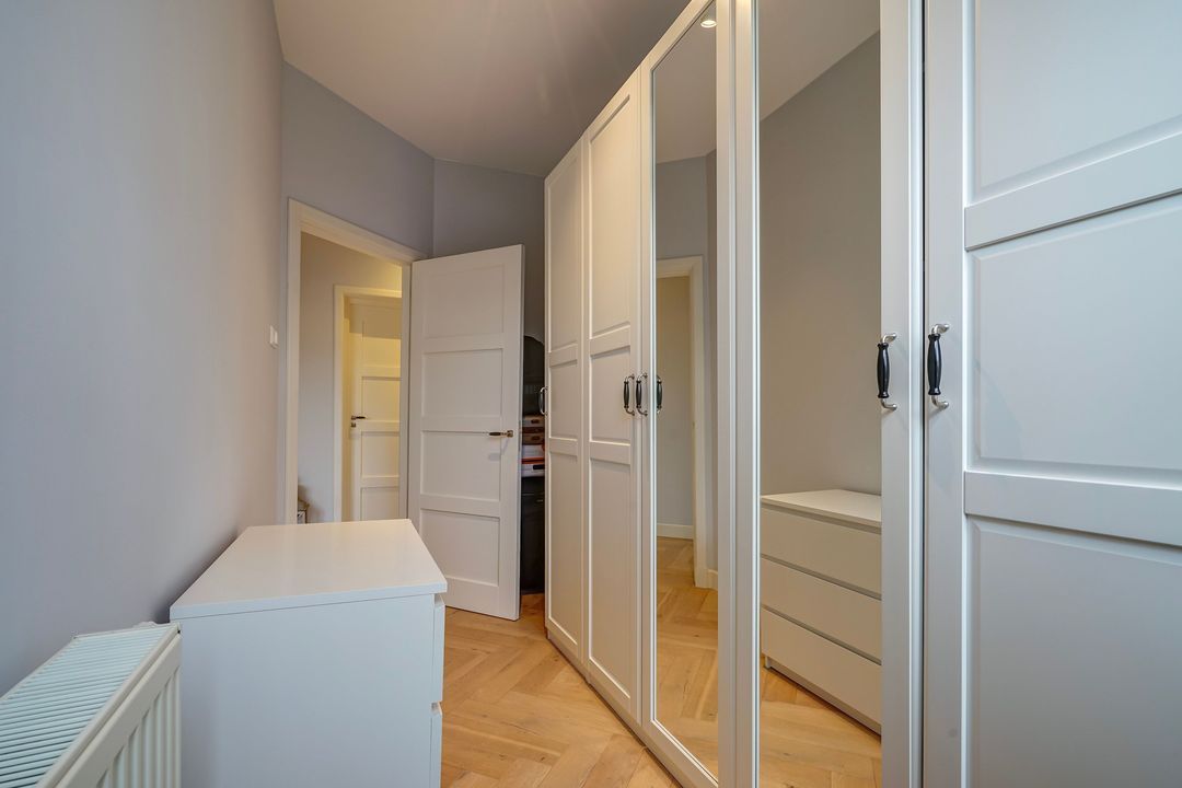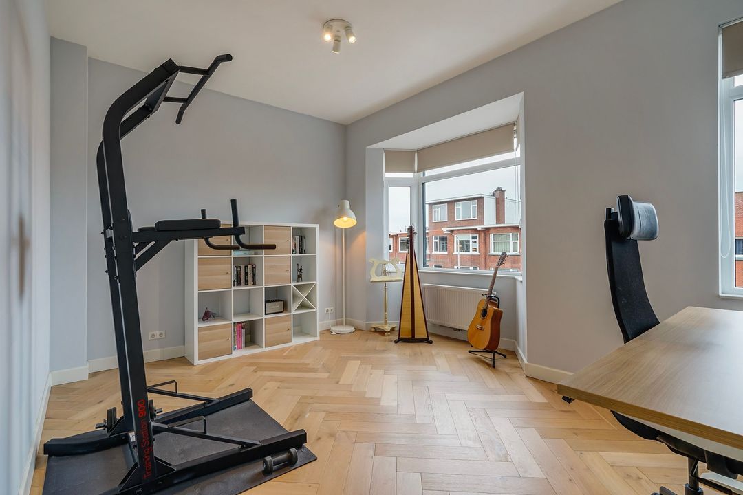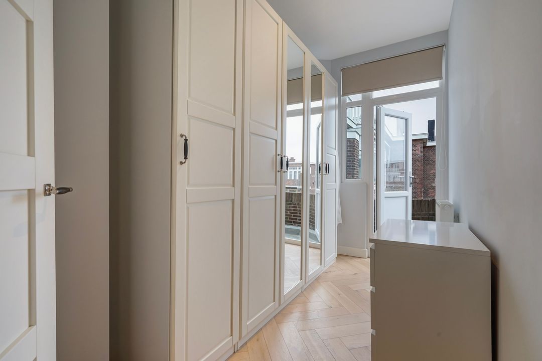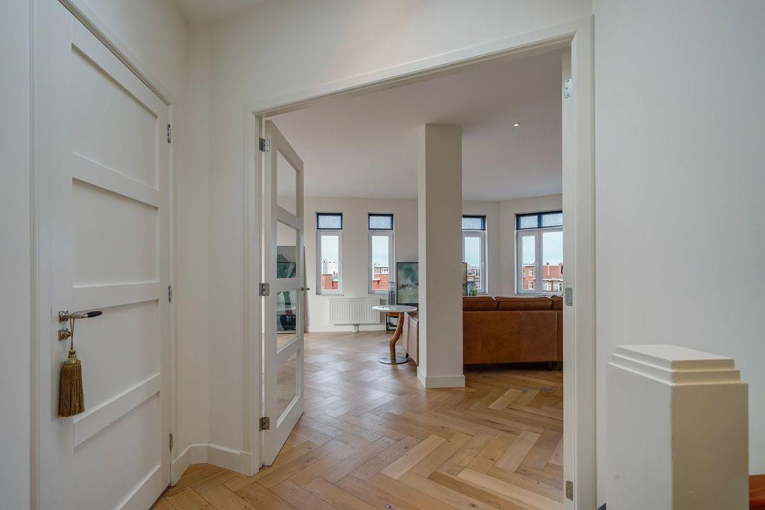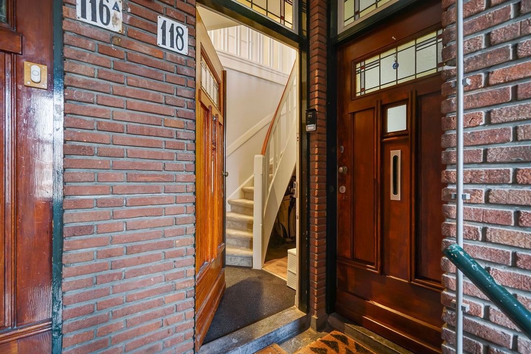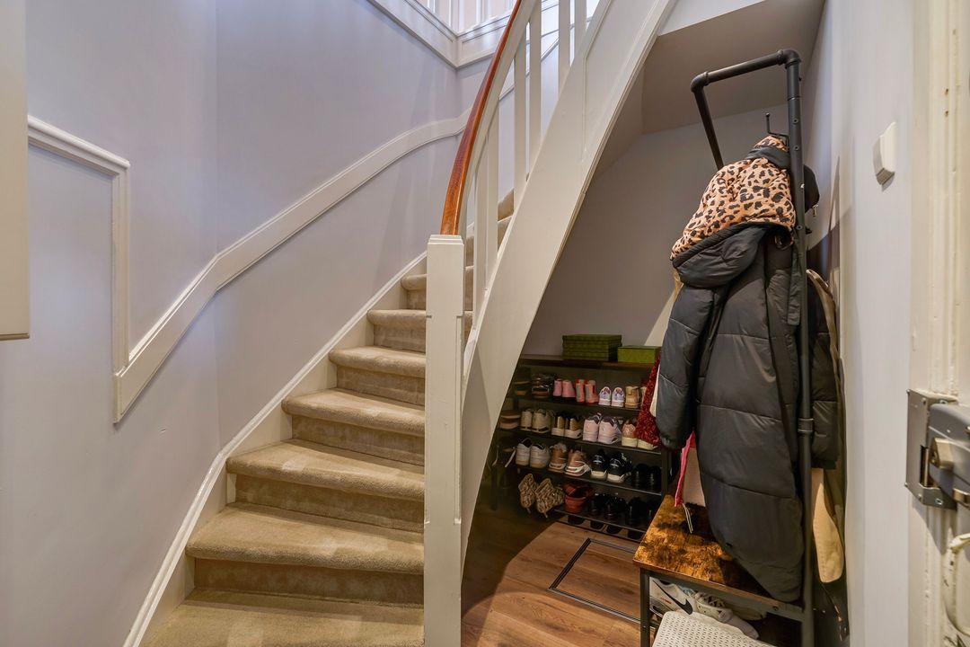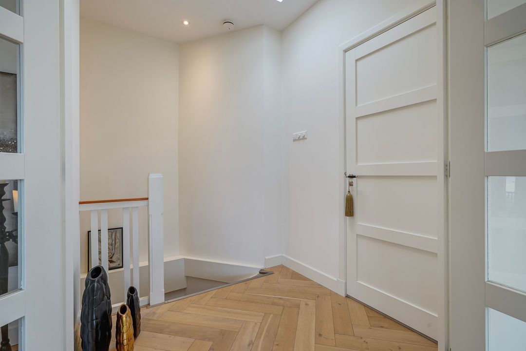 Via a "Haagsch portiek" with granite flooring and a classic front door with a stained-glass skylight you will find the entrance of the apartment on the first floor. The hallway features the meter cupboard and internal stairs (with space under the stairs) leading to the second floor.