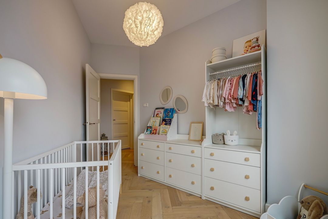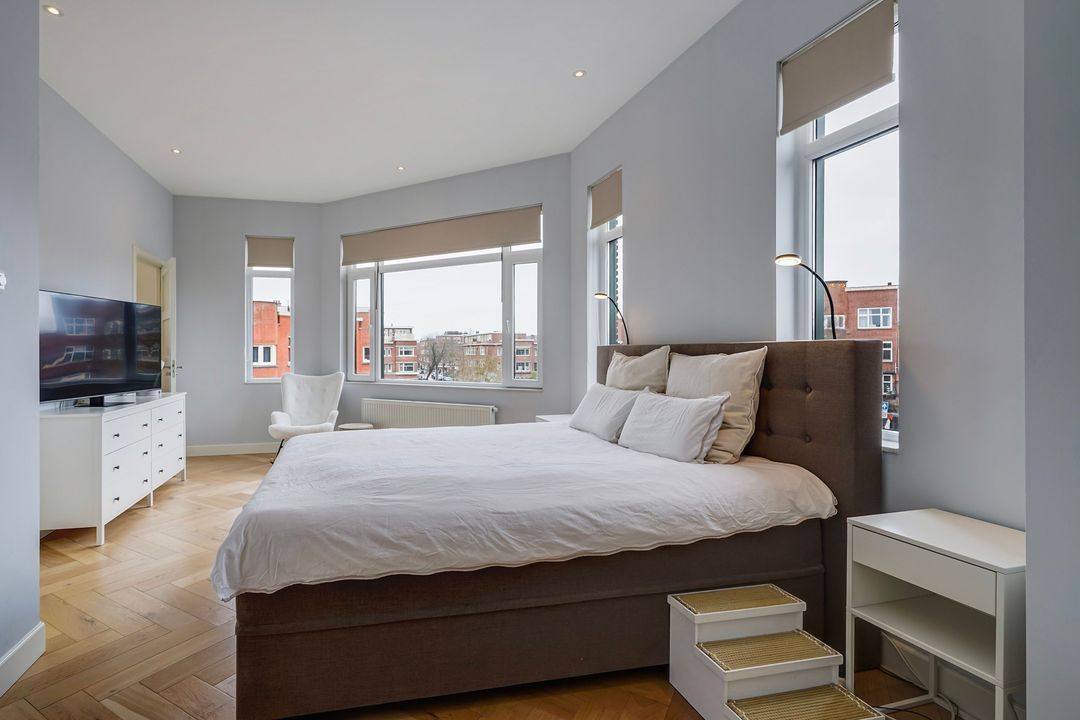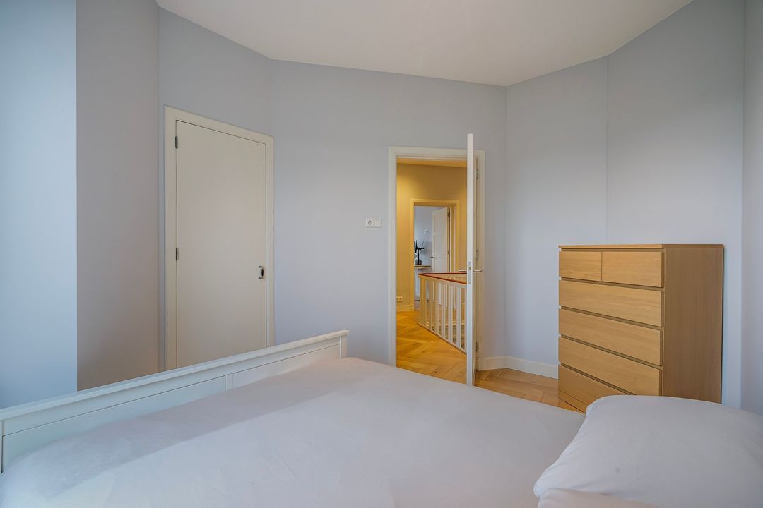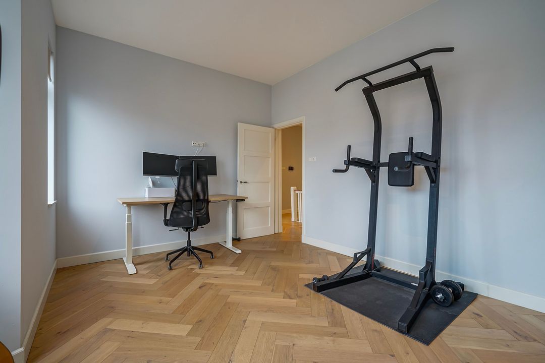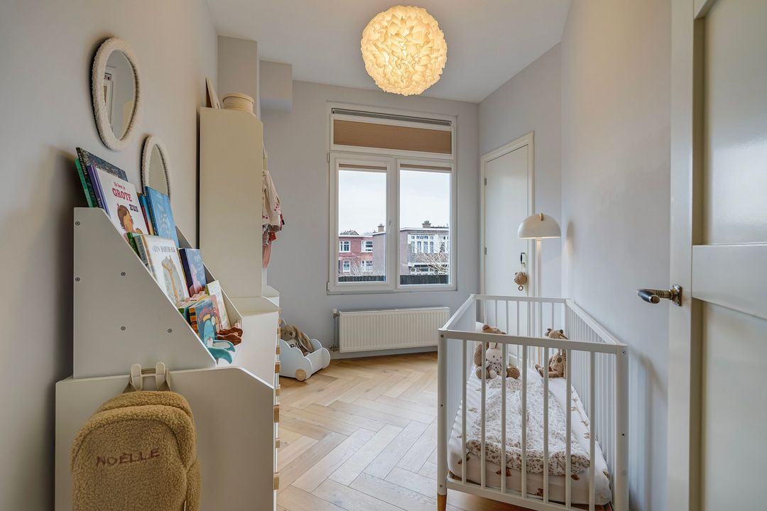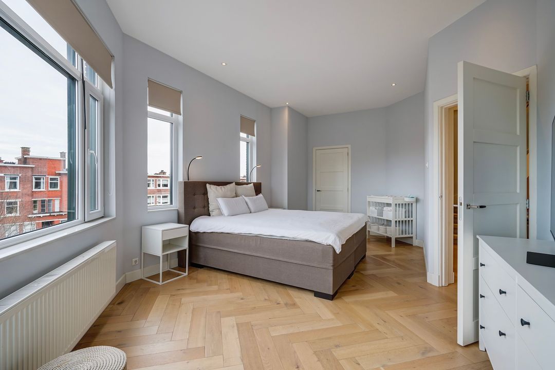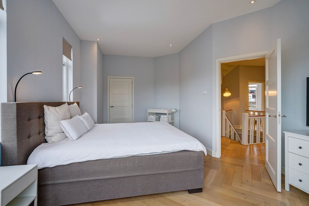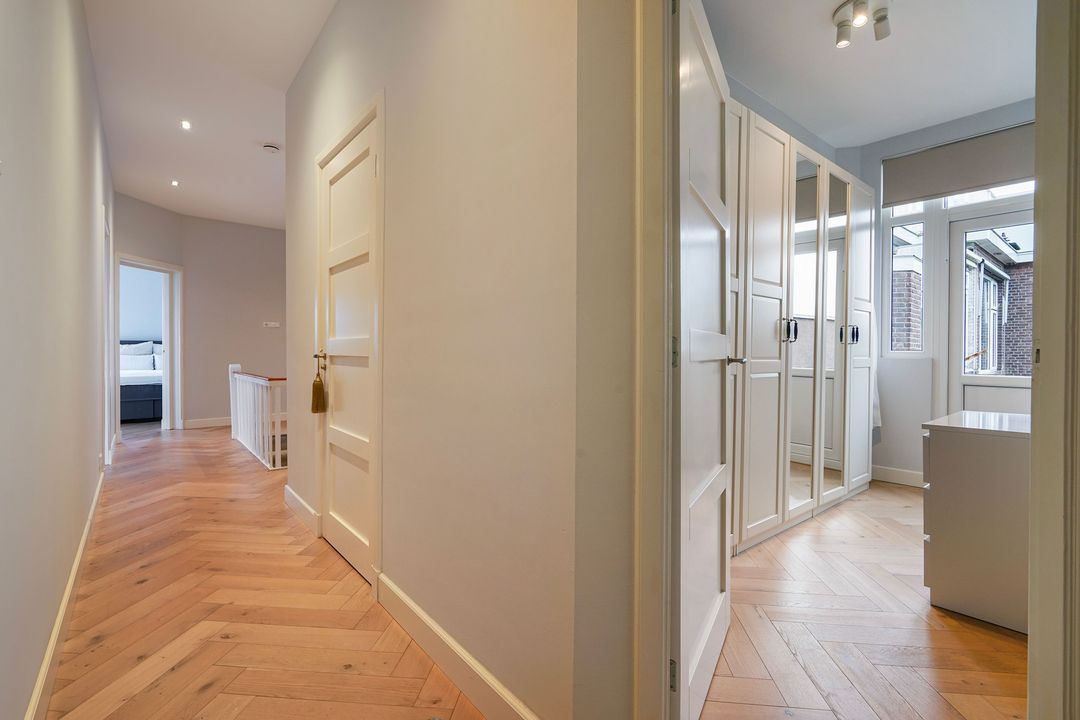 In totaal 5 kamers op de 2e verdieping, te weten; een eerste ruime voorslaapkamer op de hoek gelegen met toegang tot de waskamer en de 1e moderne fraai betegelde badkamer voorzien van ruime inloopdouche, dubbel wastafelmeubel met spiegelkast en een designradiator. Tweede lichte en ruime voorslaapkamer met een voorerker.