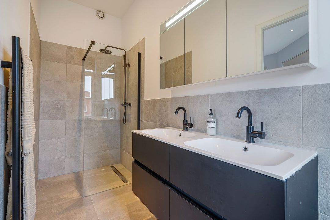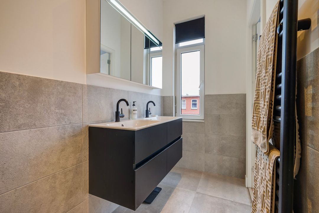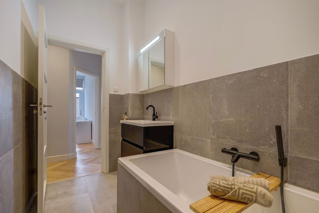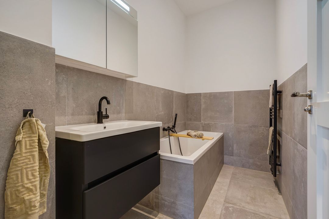 Vanuit de overloop toegang tot de 2e moderne badkamer voorzien van een ligbad, wastafelmeubel, spiegelkast en een designradiator.