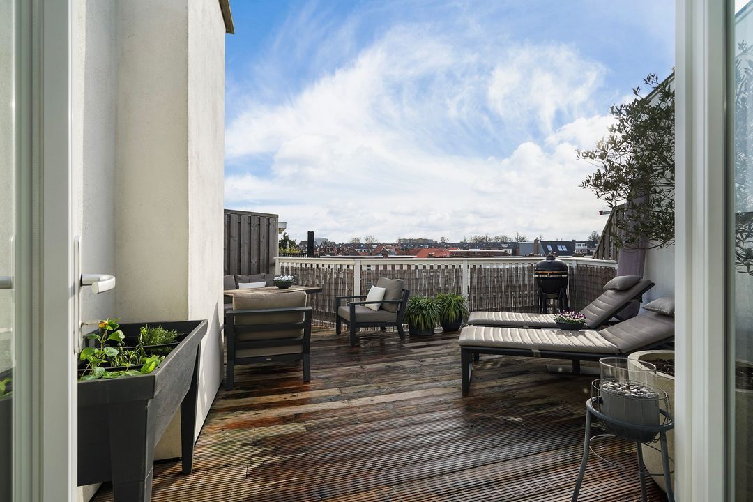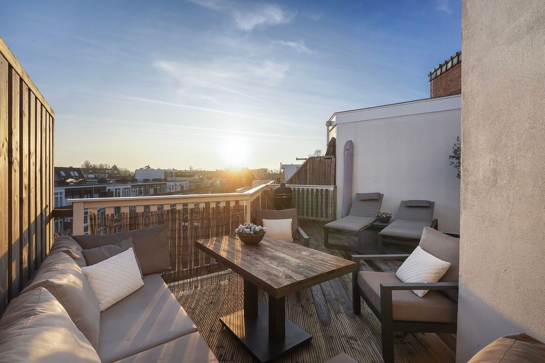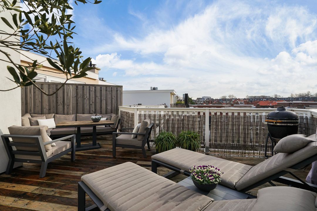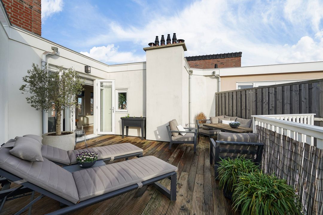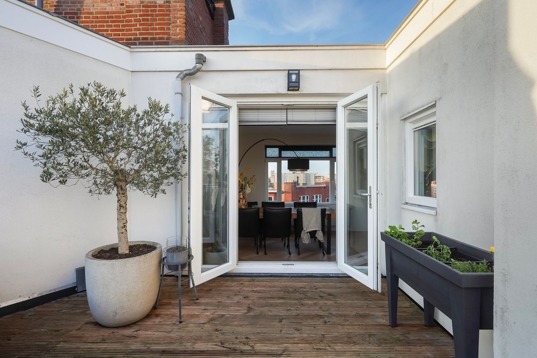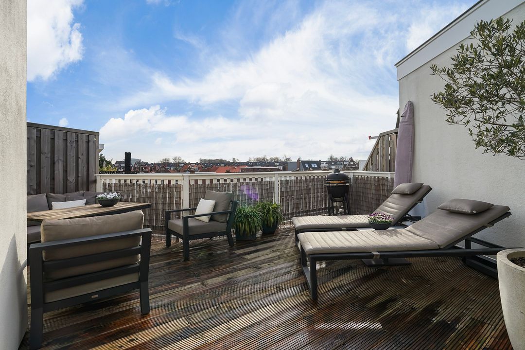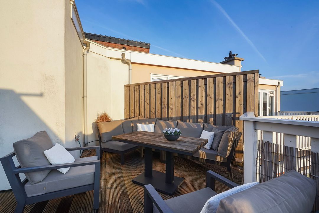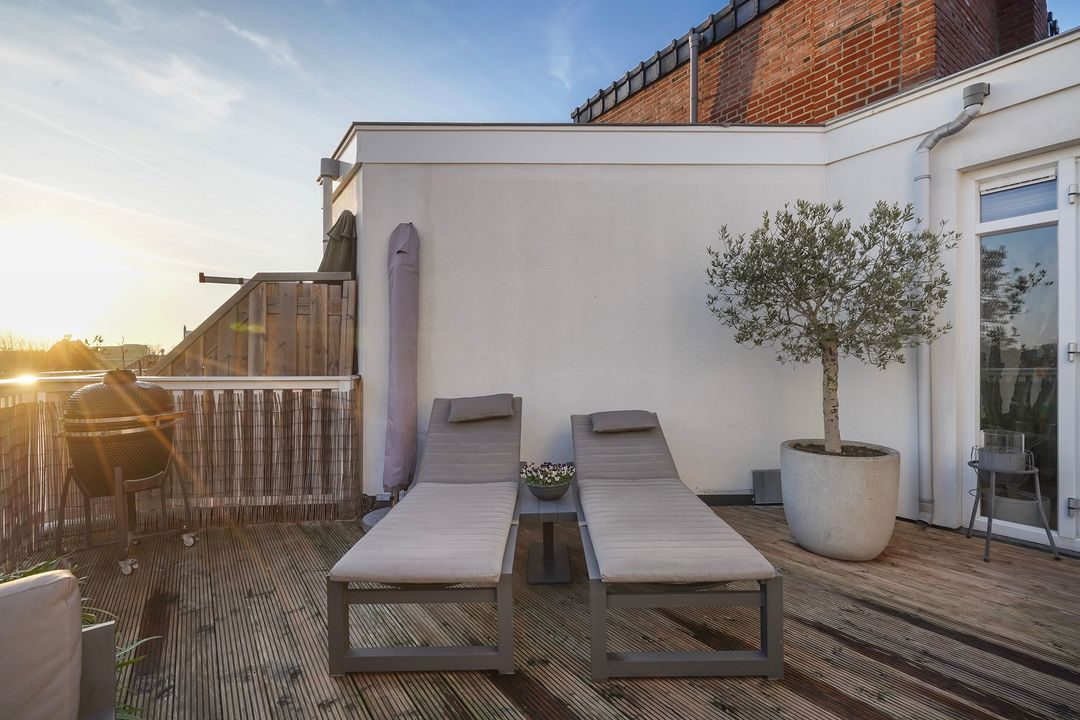 Via openslaande deuren toegang tot het zonnige dakterras, gelegen op het zuiden, voorzien van loopdekdelen, elektra en water-aansluiting.
