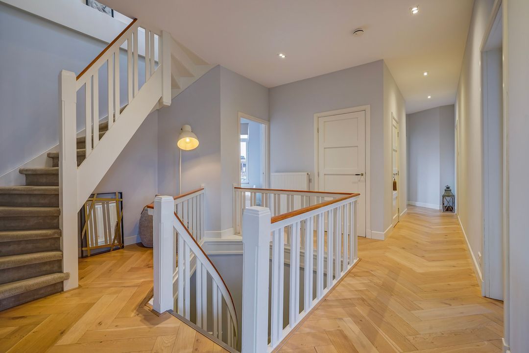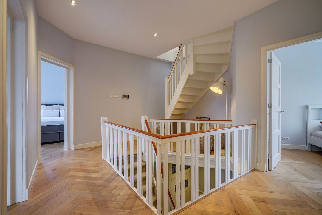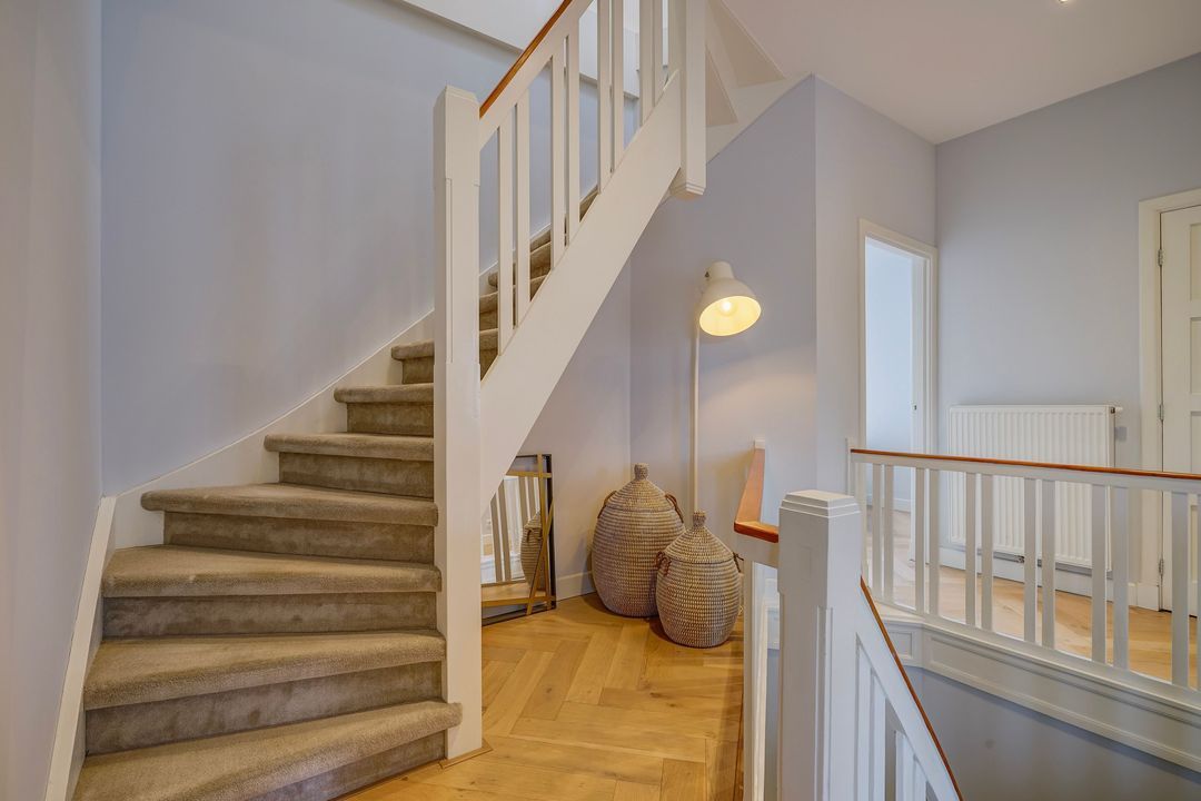 Ruime overloop met fraai en ruim opgezet trappenhuis met toegang tot alle vertrekken voorzien van een fraaie eiken houten vloer in visgraatmotief geheel doorgelegd door de woning, separaat modern toilet met fontein en vaste kast met opstelplaats cv-ketel.