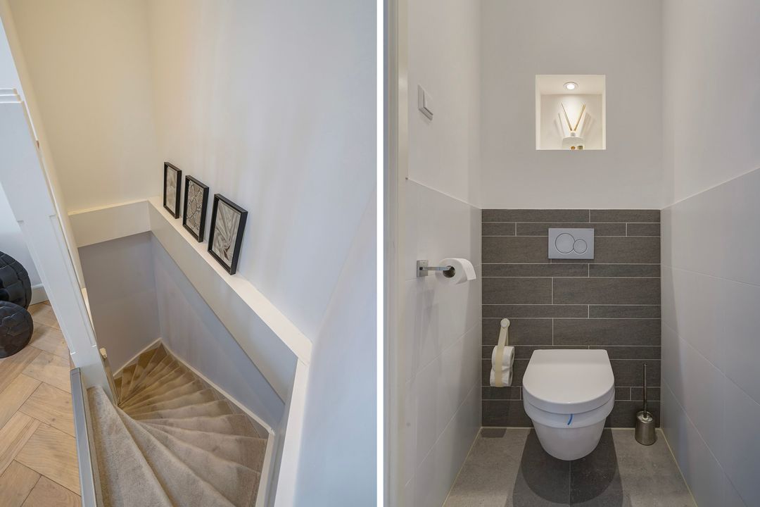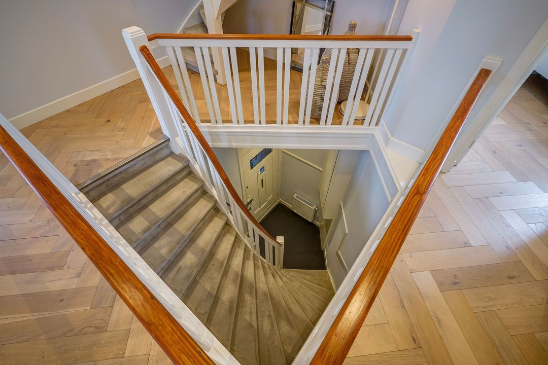 Spacious landing with a beautiful and spacious staircase providing access to all rooms, featuring a beautiful oak herringbone floor throughout the house. There is also a separate modern toilet with a hand basin and a built-in cupboard housing the central heating boiler.