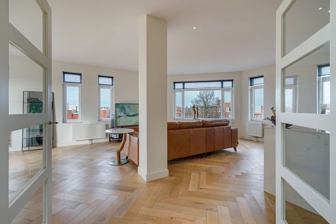 Wooden French doors lead to the beautiful corner living/dining room with unobstructed views over the Vruchtenbuurt neighborhood.