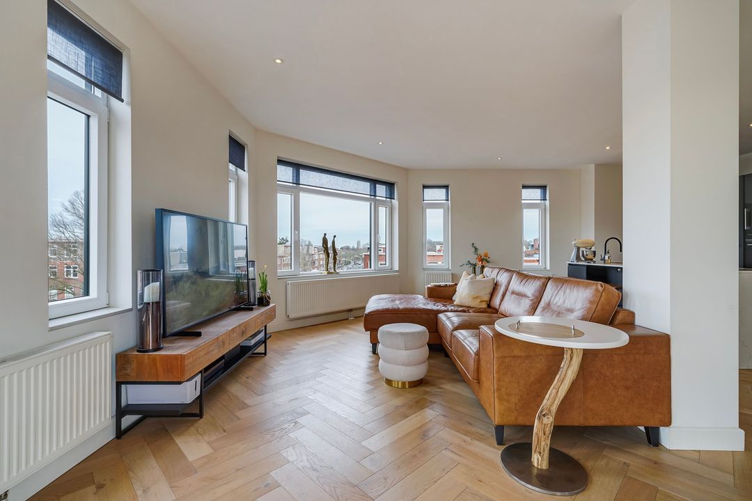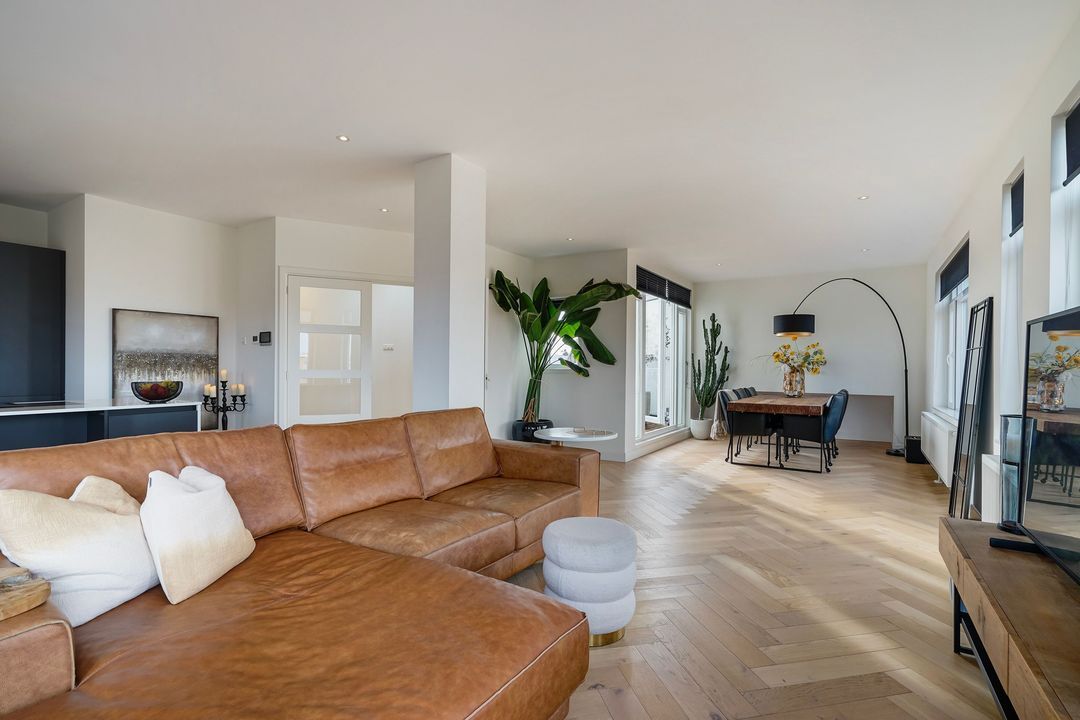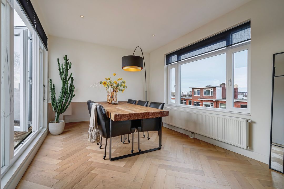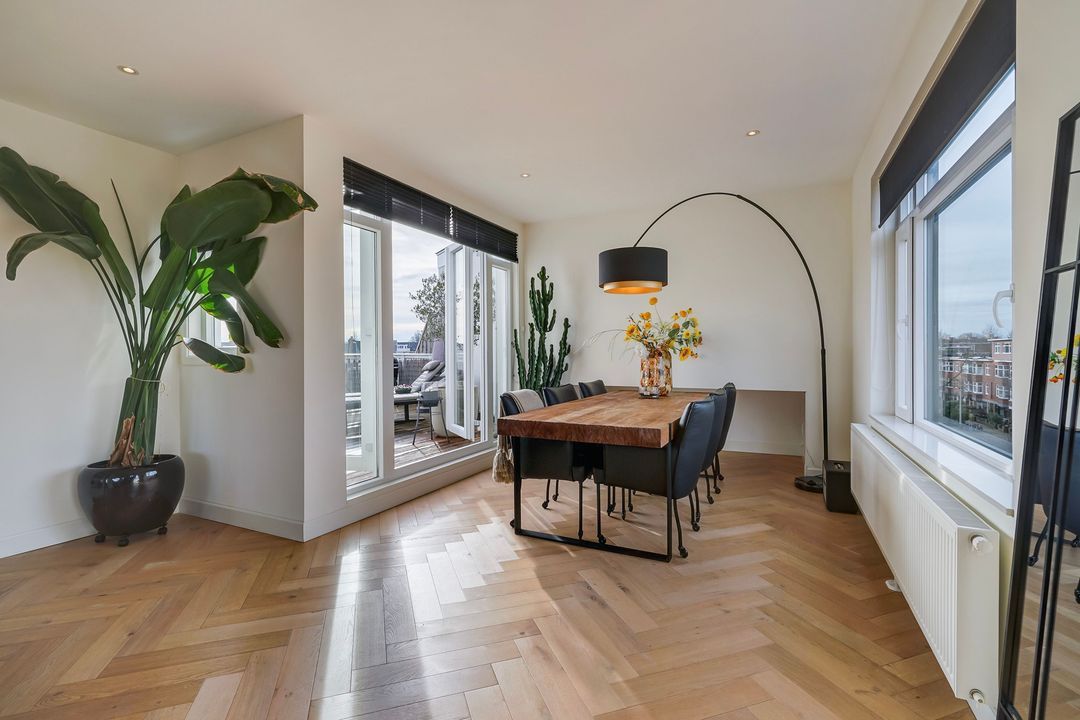 Via houten openslaande deuren toegang tot de fraaie woon/eetkamer op de hoek gelegen met vrij uitzicht over de Vruchtenbuurt.