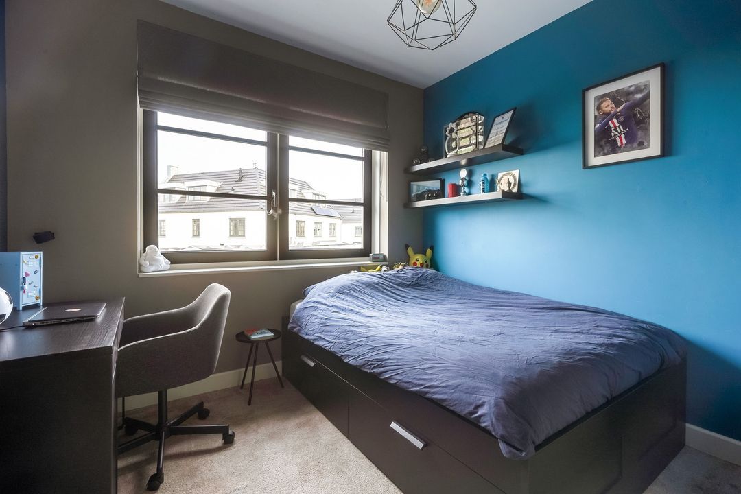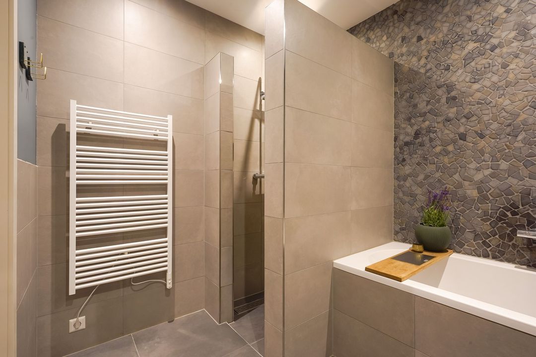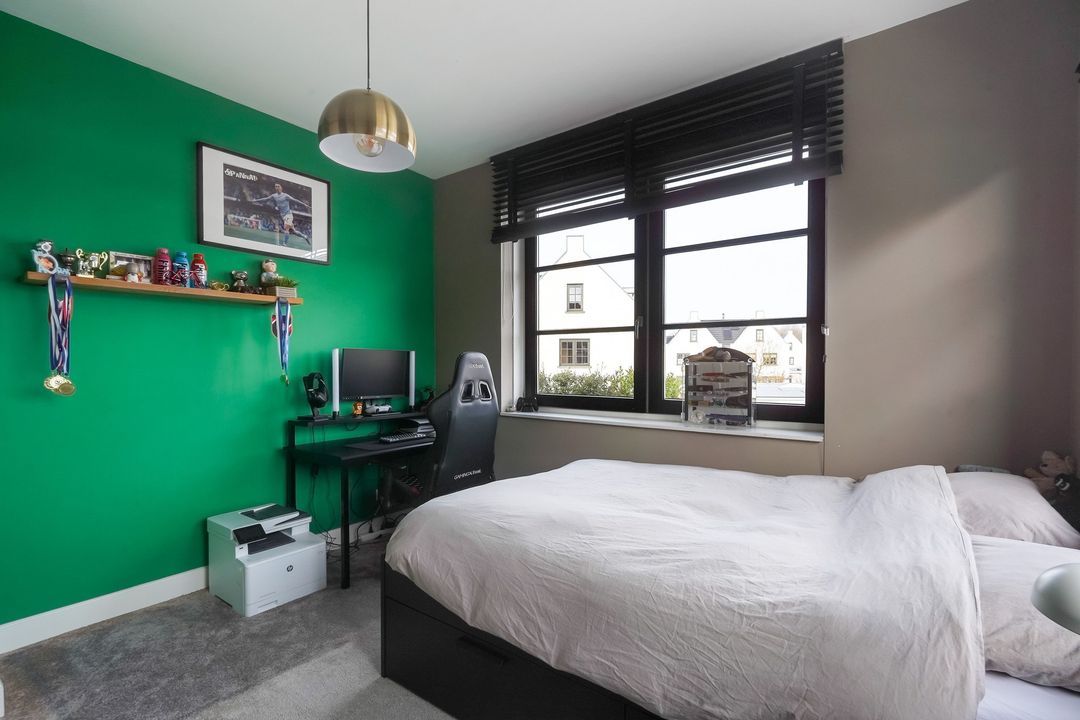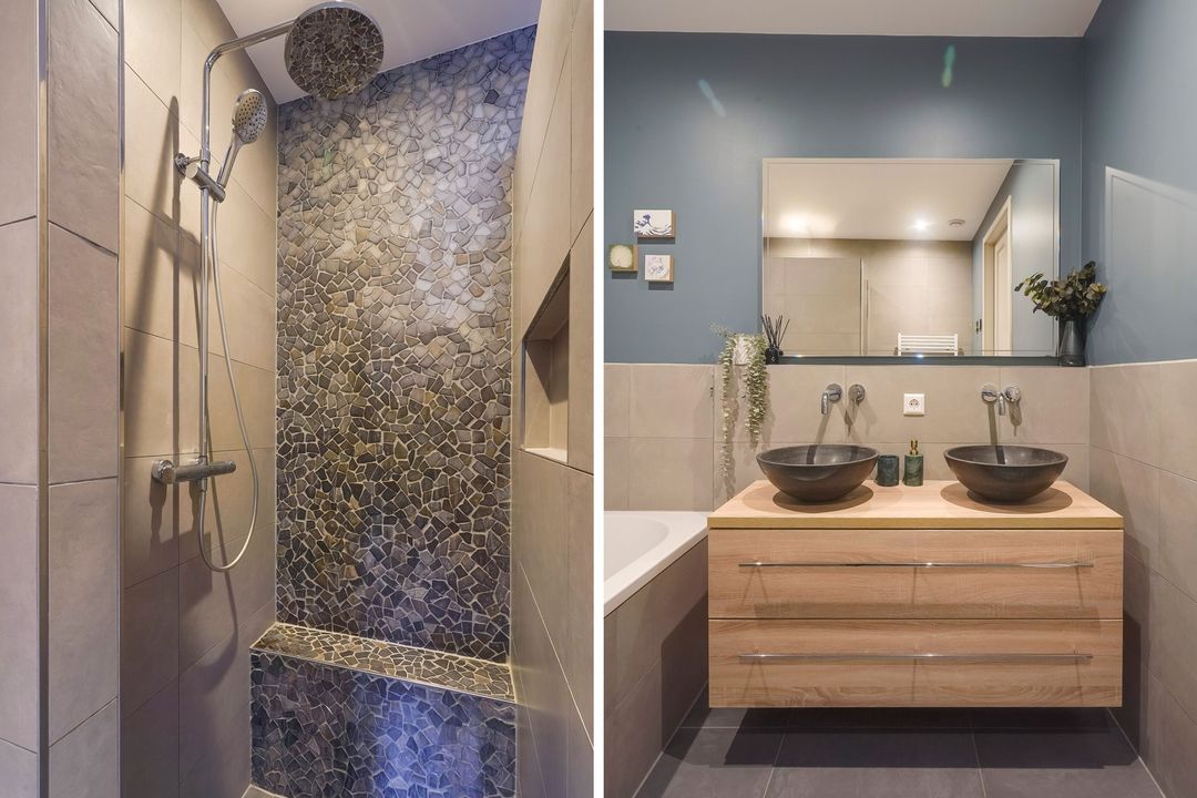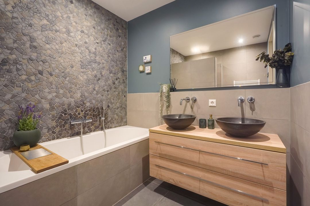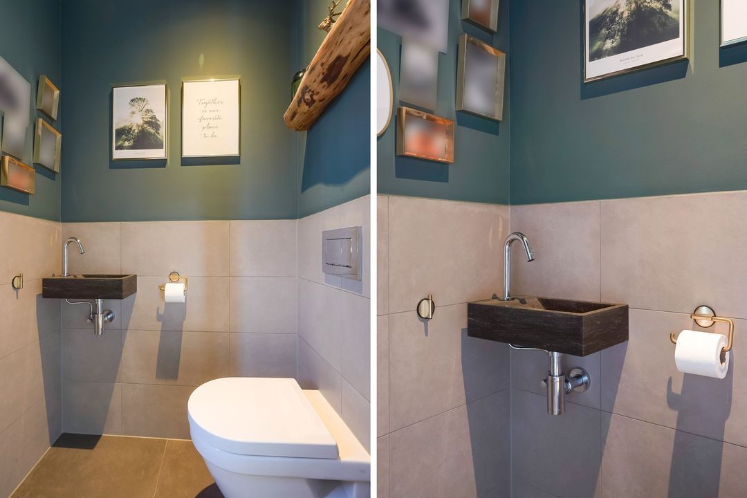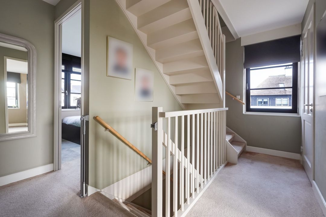 Landing with side window, separate modern toilet with hand basin. Spacious and bright front bedroom with unobstructed views. Adjacent, a modern, beautifully tiled bathroom with a bathtub, walk-in (rain) shower, two vanity units, and built-in faucets. Two bedrooms at the rear.