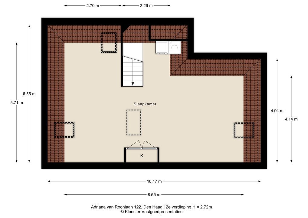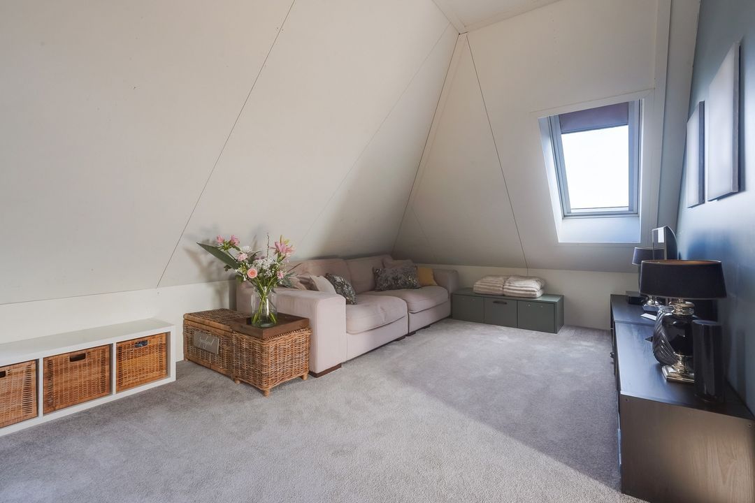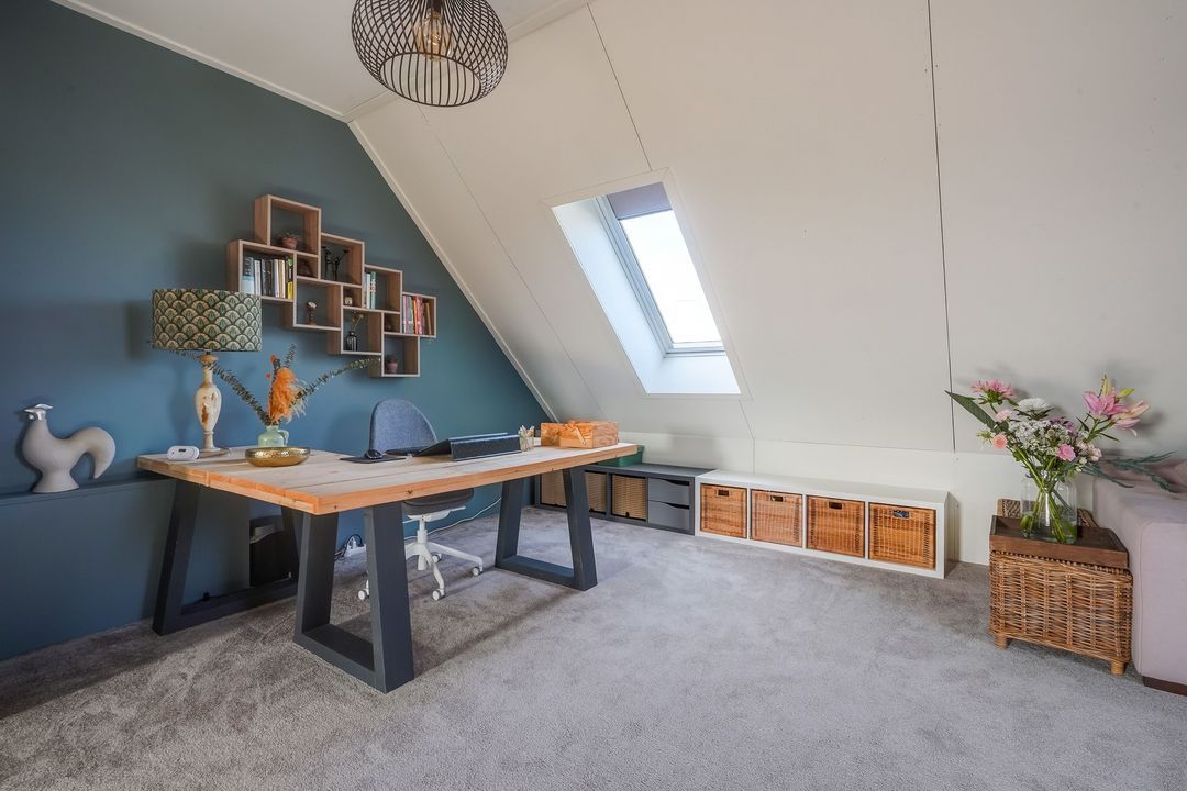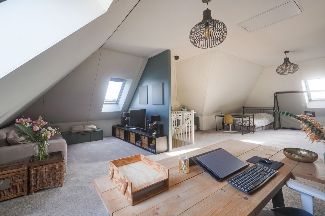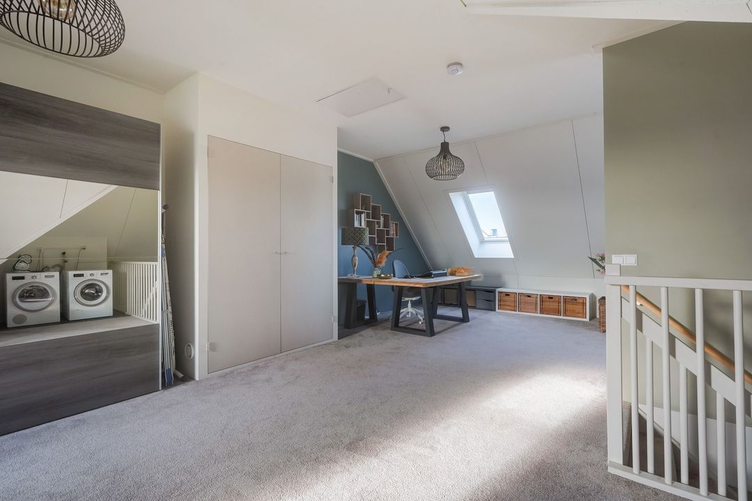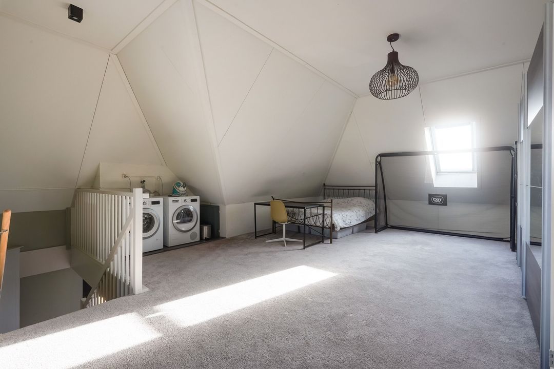 Ruime kapverdieping, op dit moment ingedeeld als 1 open ruimte, voorzien van 3 Velux dakramen, aansluitingen voor de wasmachine- en droger en opstelplaats warmtepomp. De verdieping kan worden opgedeeld in 2 slaapkamers en een 2e badkamer.
