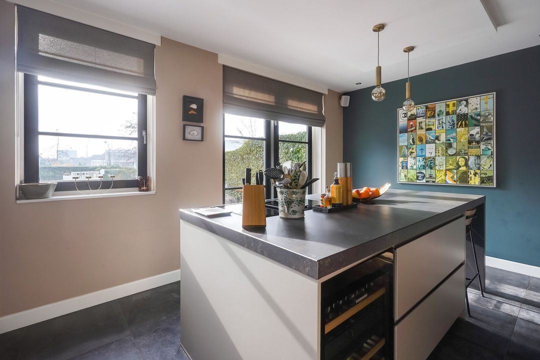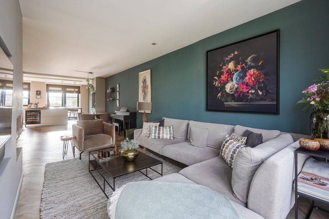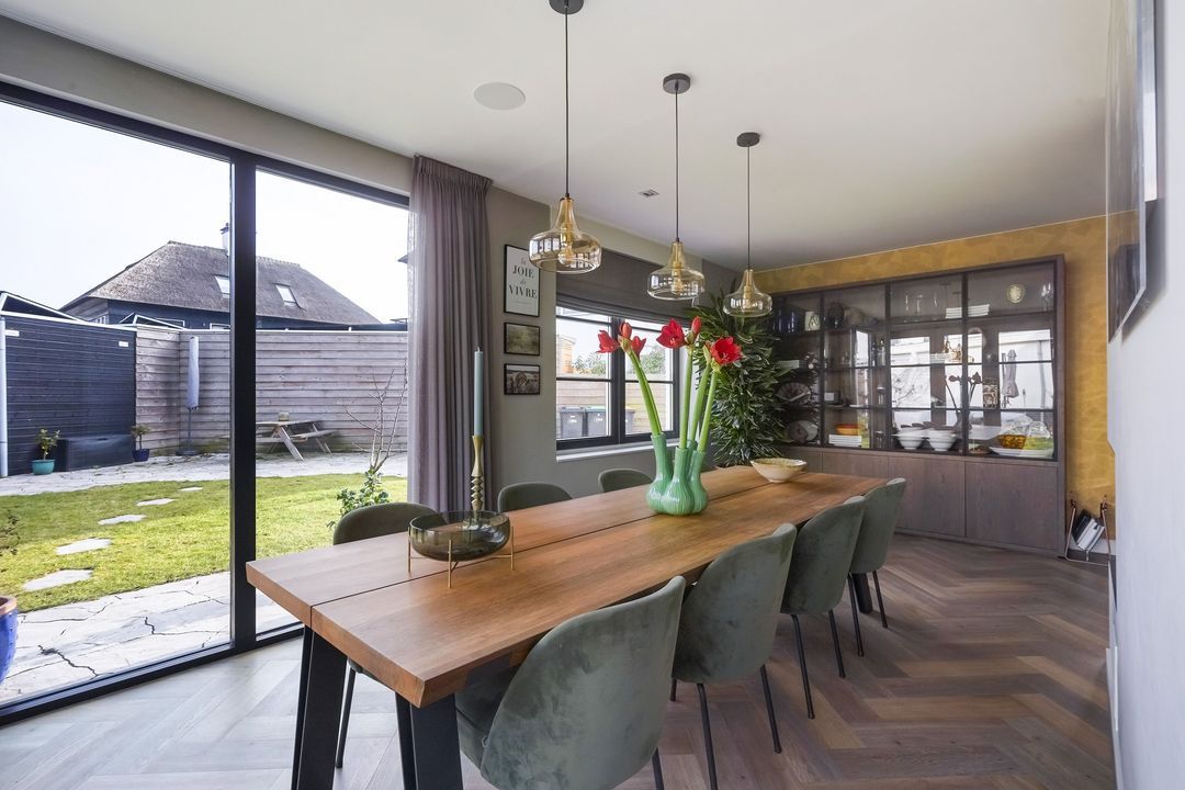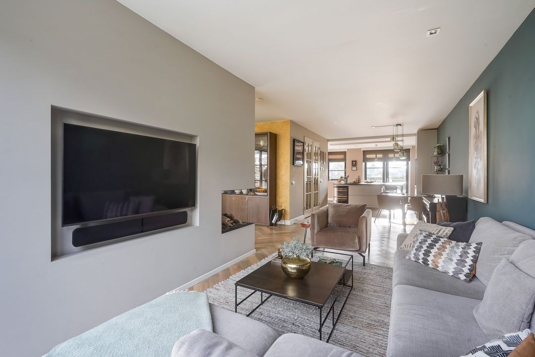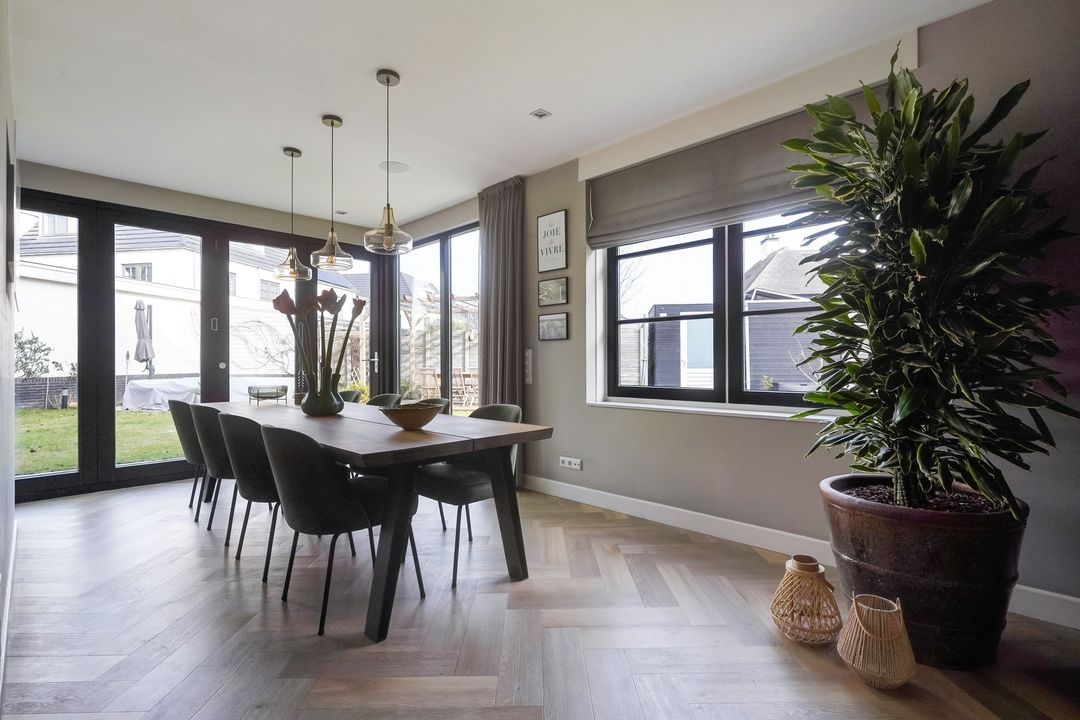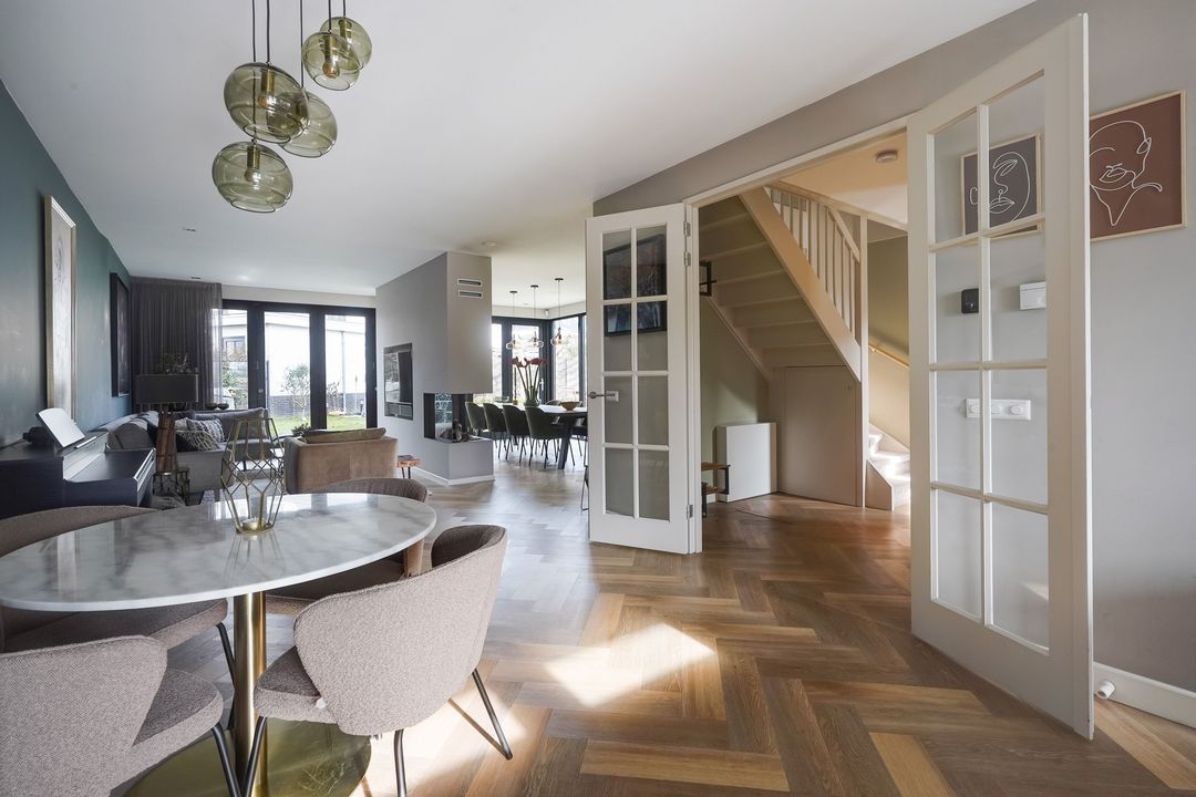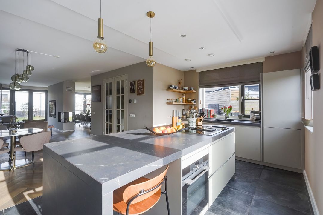 Via dubbele deuren toegang tot de sfeervolle, lichte en uitgebouwde woon-/eetkamer met luxe open keuken aan de voorzijde met een kookeiland voorzien van een inductiekookplaat met geïntregeerde afzuiging, oven/stoomoven, wijnklimaatkast, Quooker, koel/vriescombinatie, vaatwasser en veel opbergruimte.