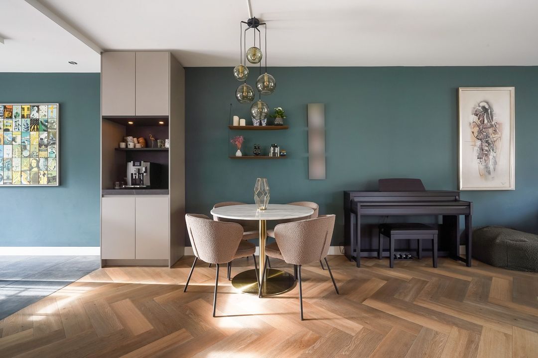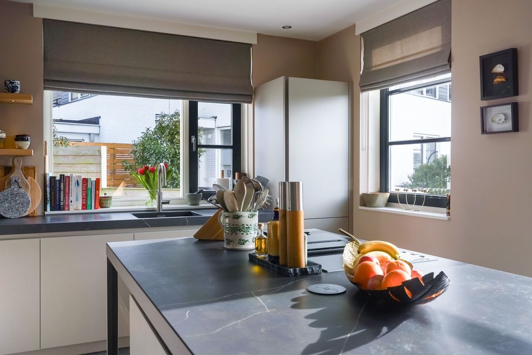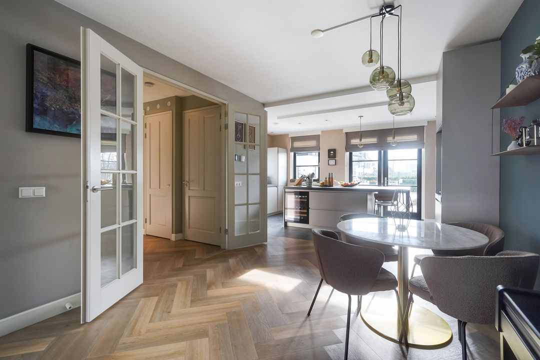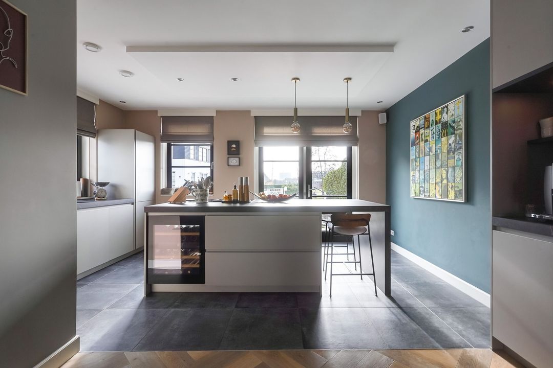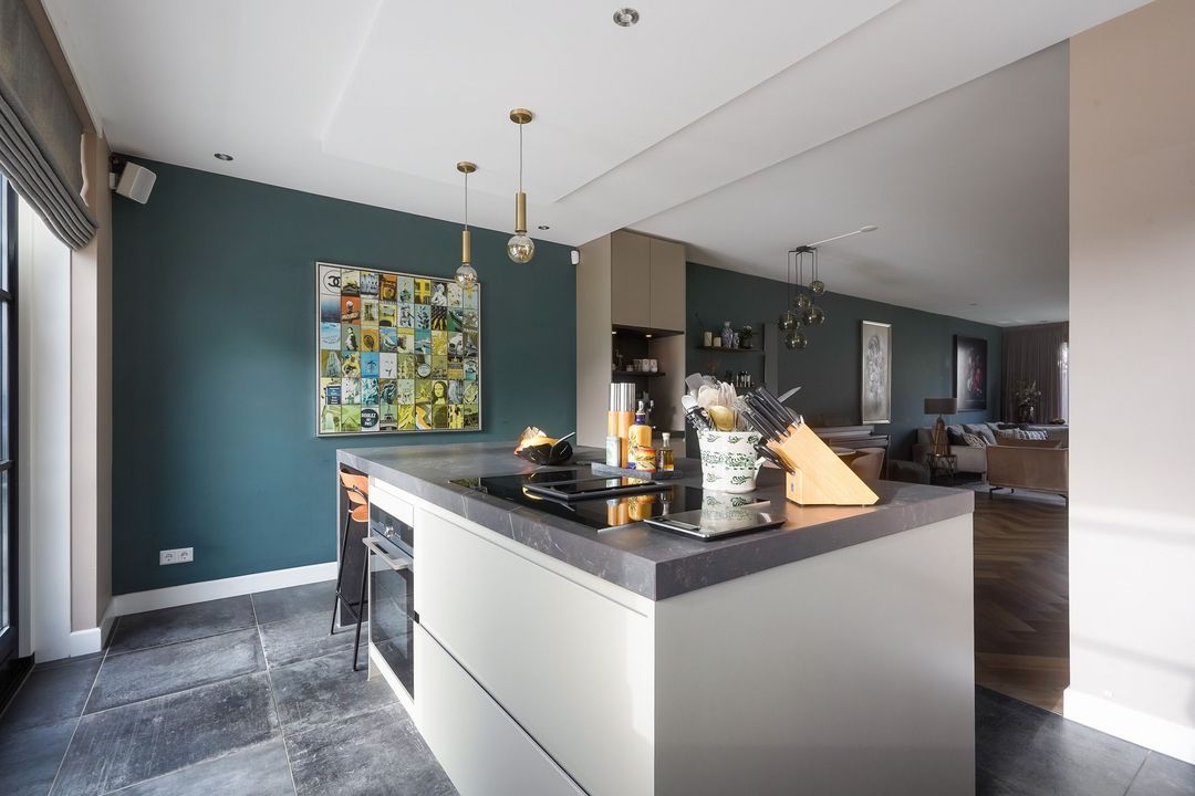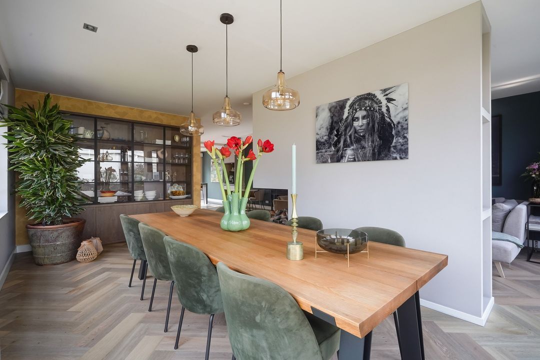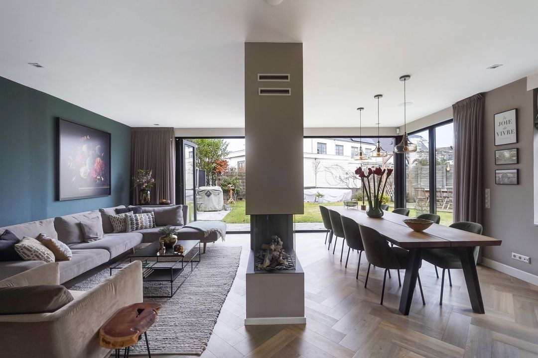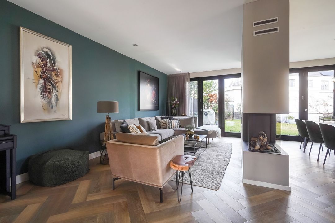 Via dubbele deuren toegang tot de sfeervolle, lichte en uitgebouwde woon-/eetkamer met luxe open keuken aan de voorzijde met een kookeiland voorzien van een inductiekookplaat met geïntregeerde afzuiging, oven/stoomoven, wijnklimaatkast, Quooker, koel/vriescombinatie, vaatwasser en veel opbergruimte.