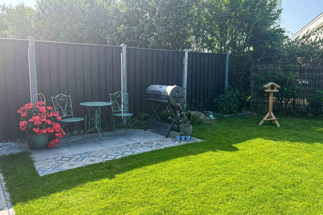 The spacious, beautifully landscaped, and sunny back/side garden boasts several patios and a wooden shed with electricity. Due to the location of the garden, there is sun all day long.