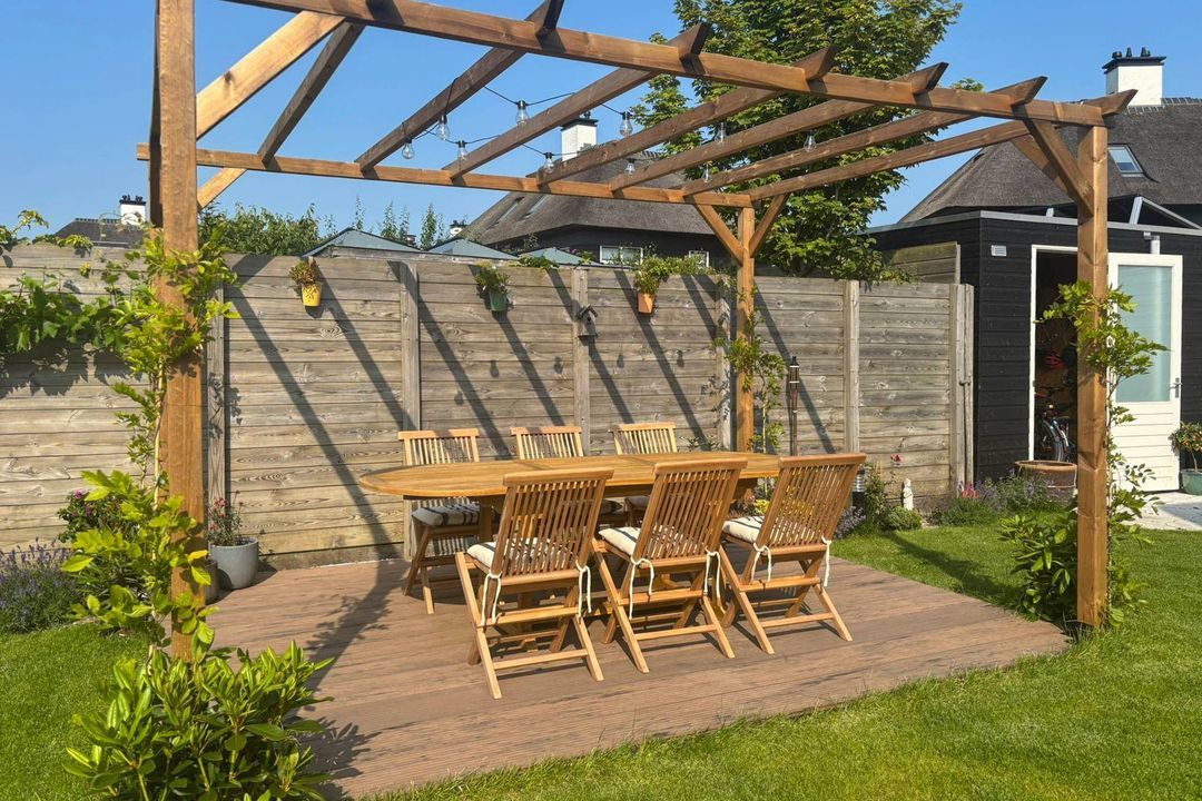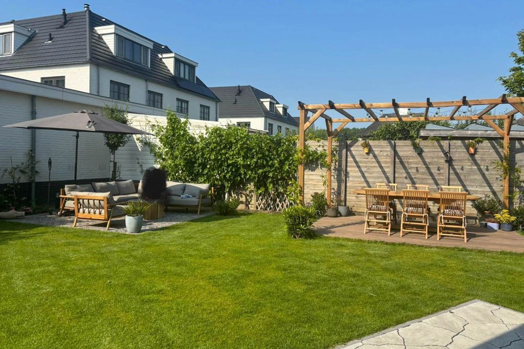 De riante, fraai aangelegde en zonnig gelegen achter-/zijtuin is voorzien van meerdere terrassen en een houten berging met elektra. Door de ligging van de tuin is er de gehele dag zon.