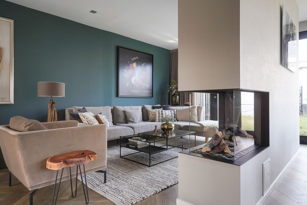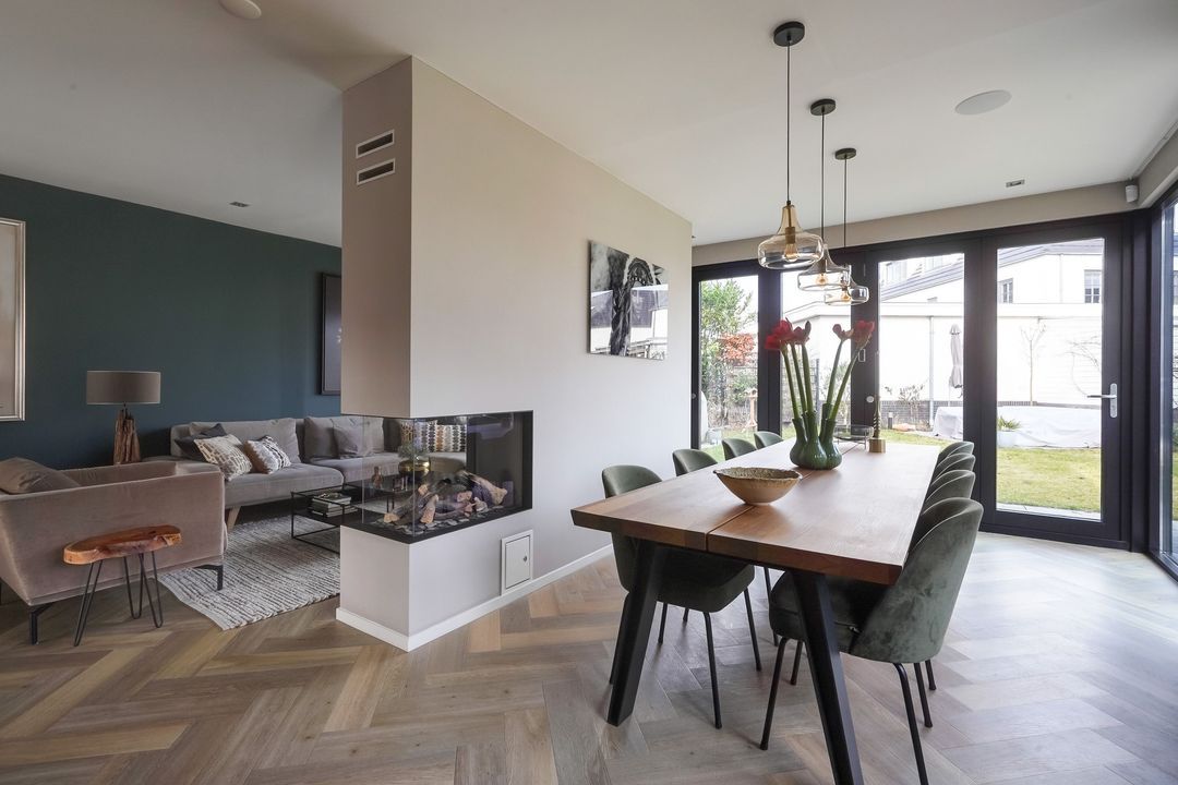 The living room features an electric fireplace centrally located in the seating area, side windows, and has been extended with a beautiful folding door leading to the back garden.