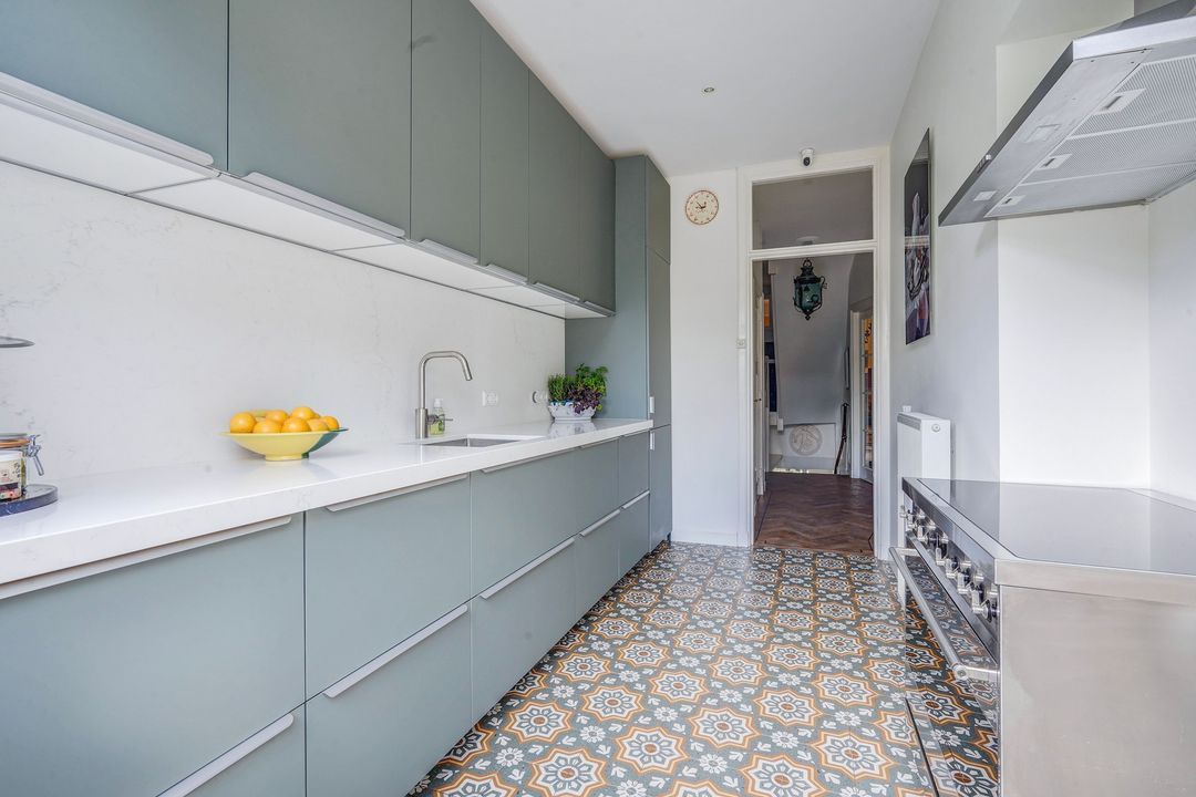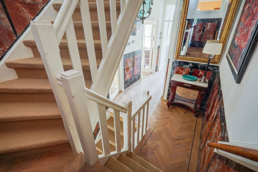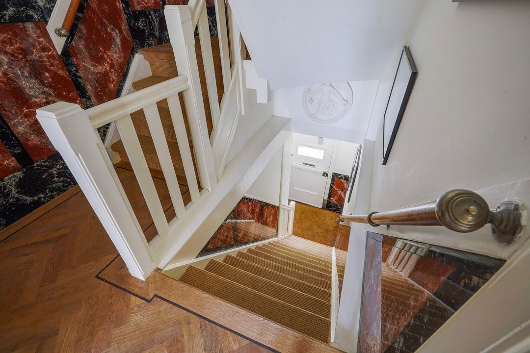 Apartment entrance at street level, hallway with beautiful original wall tiles, meter cupboard, and stairs to the first floor.