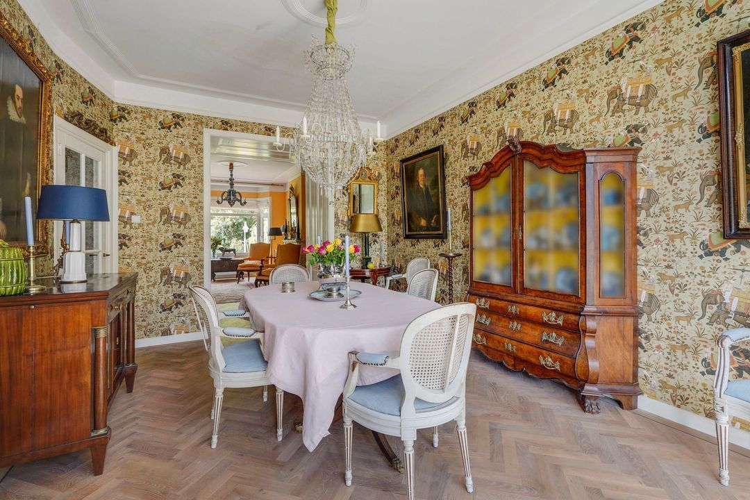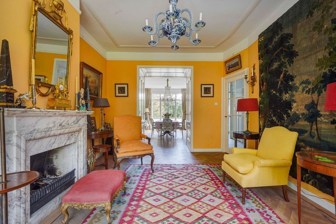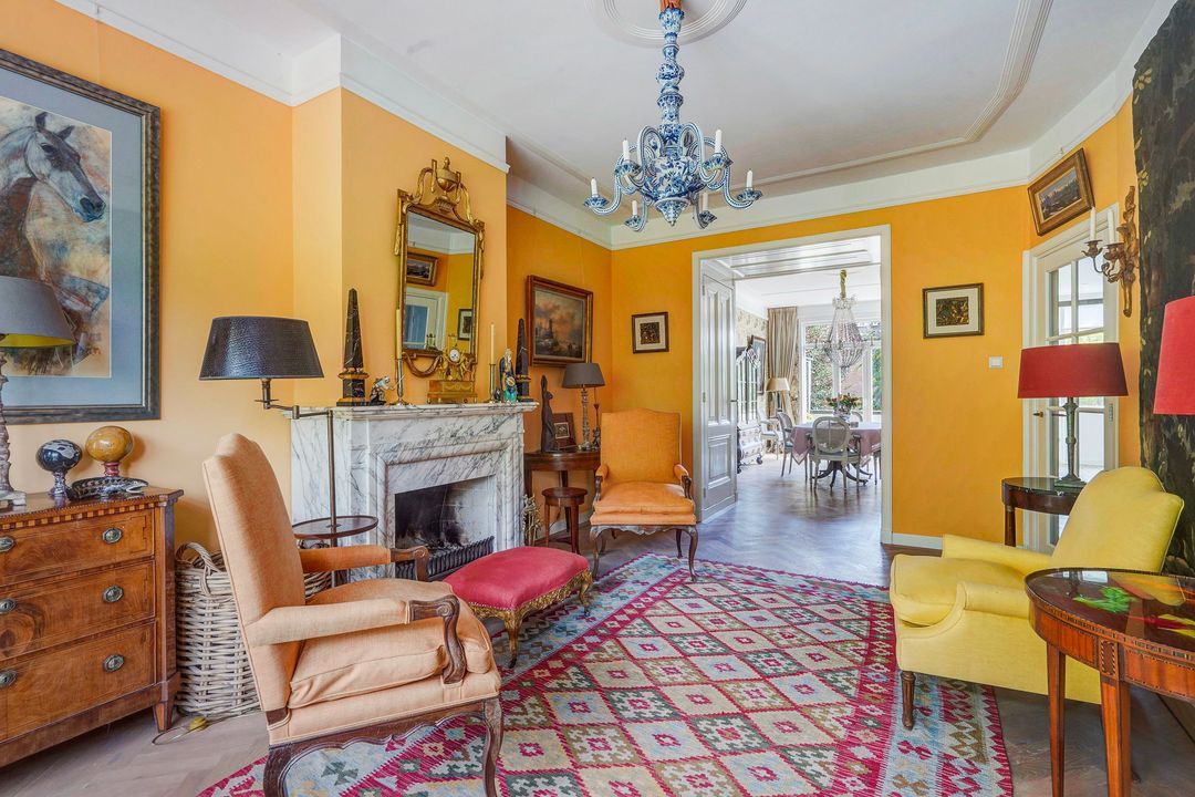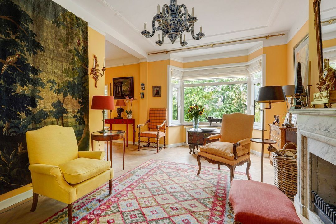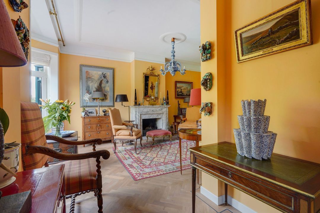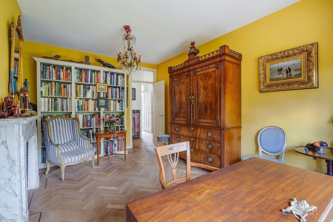 Heerlijke sfeervolle L-vormige originele kamer en suite met 2 vaste kasten, ornamenten plafonds, werkende open haard met fraaie marmeren schouw, bijgetrokken voorzijkamer, voorerker met prachtig vrij uitzicht over het waterplantsoen en dubbele deuren naar het zonnige achterbalkon voorzien van elektrisch zonnescherm en gelegen op het zuidoosten.