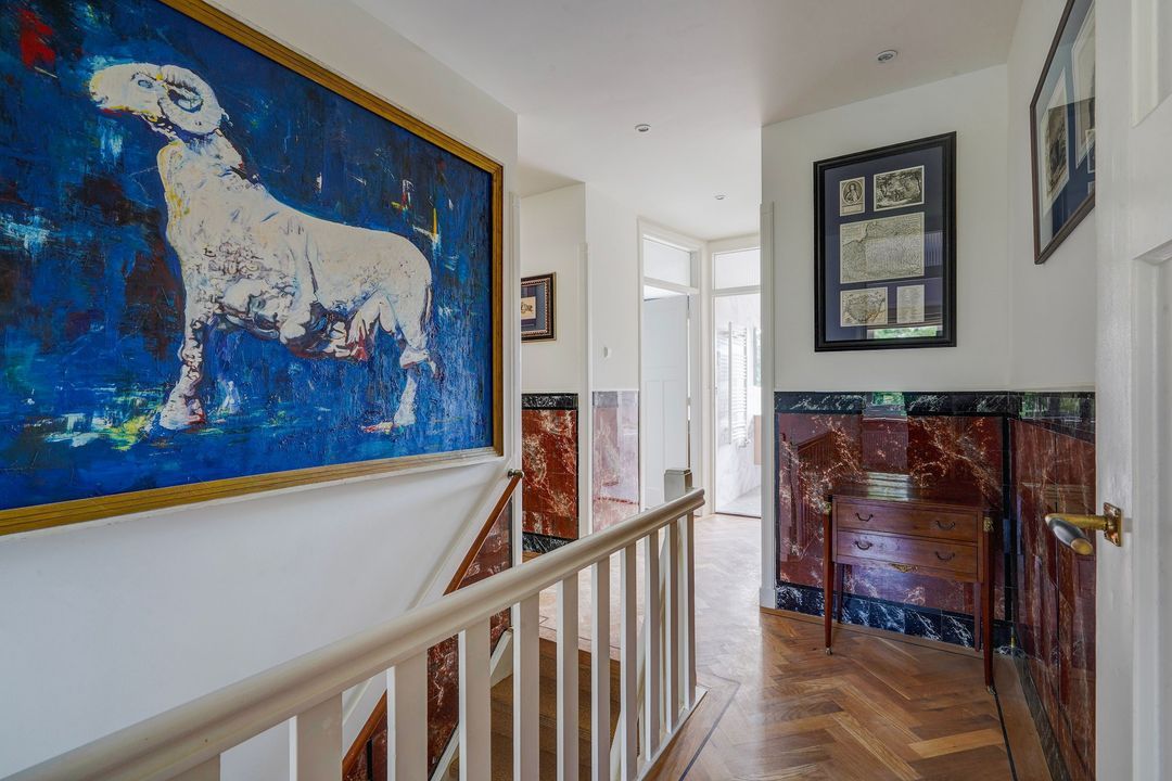 Landing with herringbone parquet flooring with a border running through each floor, separate modern toilet with handbasin and wardrobe.