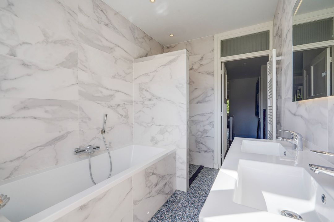 Aan achterzijde ruime luxe badkamer voorzien van inloopdouche, ligbad, dubbele wastafelmeubel, handdoekradiator en verwarmde spiegel met ledverlichting.