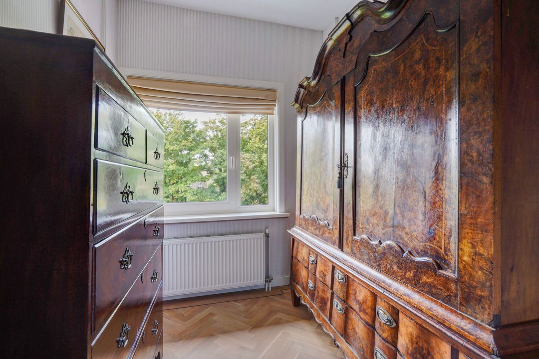 Ruime voorslaapkamer met marmeren schouw en via erker wederom prachtig vrij uitzicht op het plantsoen. Tweede (kleine) voorslaapkamer.
