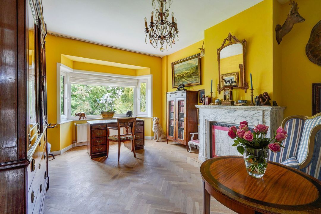 Lovely, atmospheric L-shaped original en suite room with two built-in wardrobes, ornamental ceilings, a working fireplace with a beautiful marble mantelpiece, an adjoining front room, a bay window with a beautiful unobstructed view of the water park, and double doors leading to the sunny rear balcony with an electric awning and southeast-facing location.