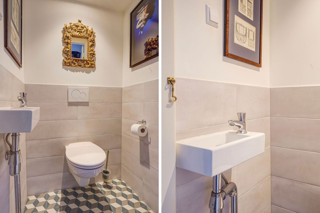 Overloop voorzien van visgraat parketvloer met bies doorgelegd op elke verdieping, separaat modern toilet met fontein en garderobekast.