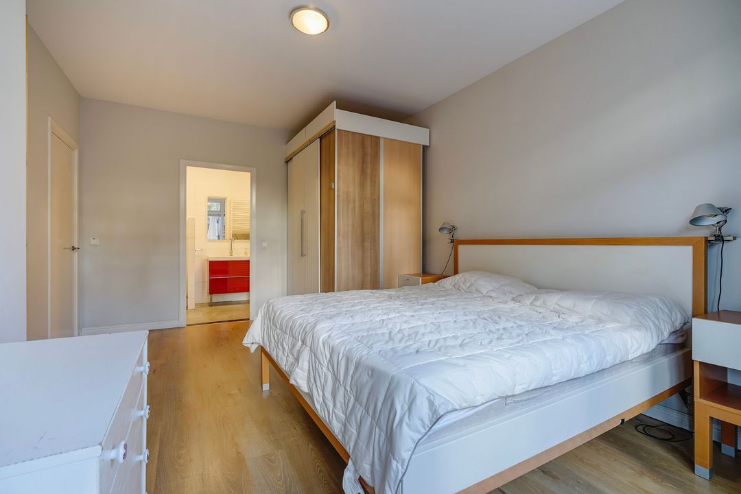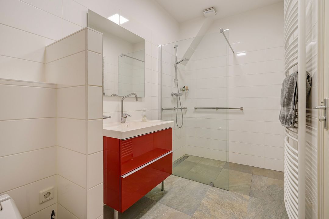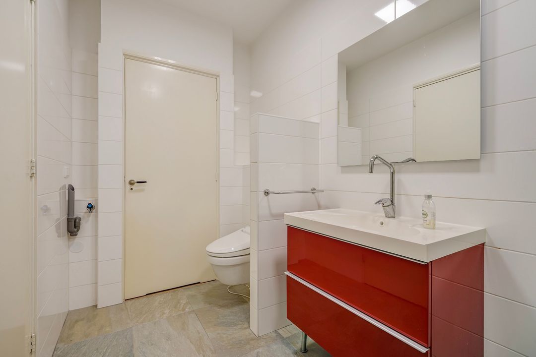 Riante voorslaapkamer met erker, tussengelegen moderne badkamer met inloopdouche, wastafelmeubel, wasmachine aansluiting en toilet.