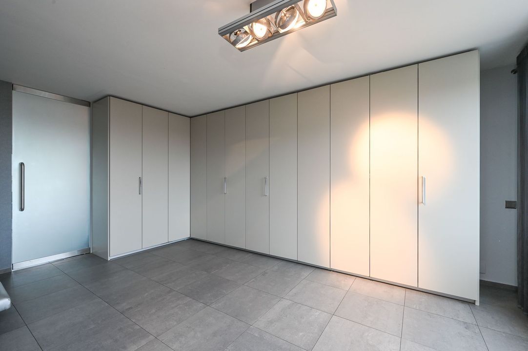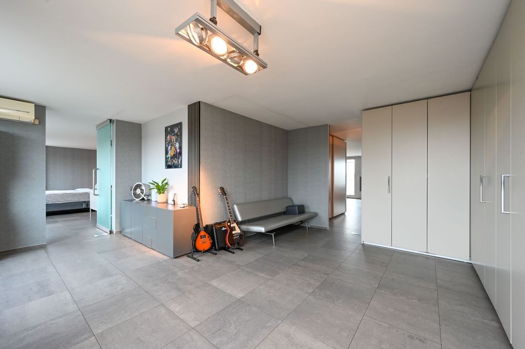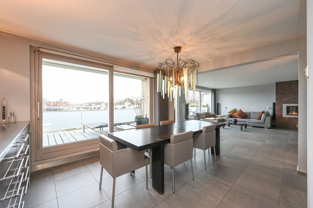 Vanuit de living via 2 schuifpuien toegang tot het riante en zonnige terras (lengte 12 meter), gelegen op het zuidwesten met vrij uitzicht, voorzien van hardhouten bankirai vlonders, elektrisch zonnescherm, plafonds met verlichting en elektrische infrarood verwarming.