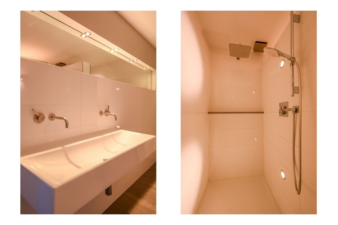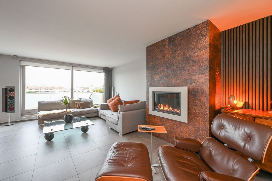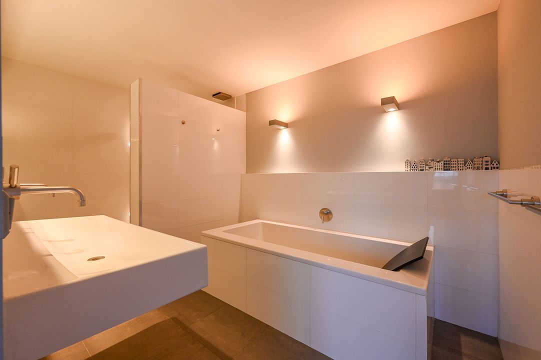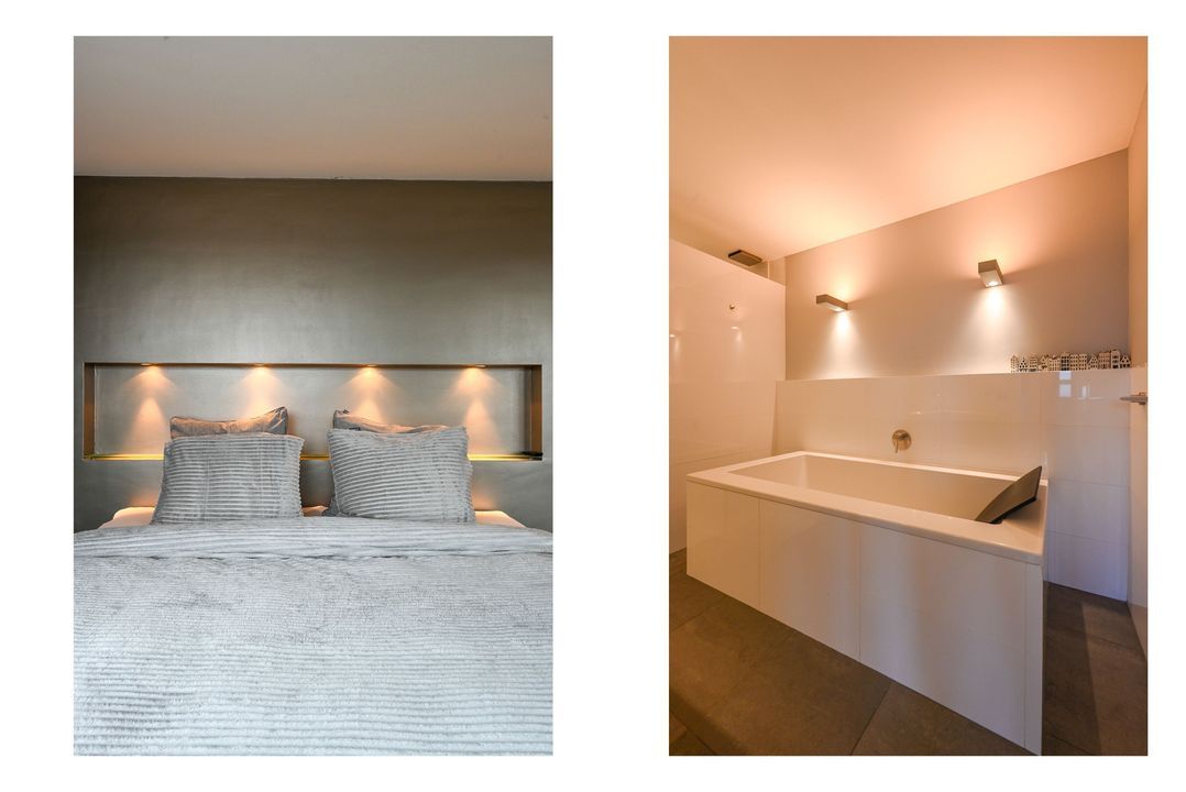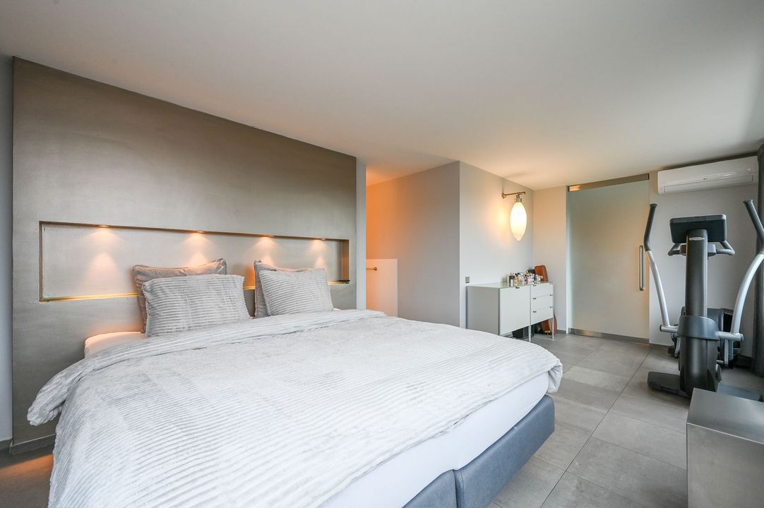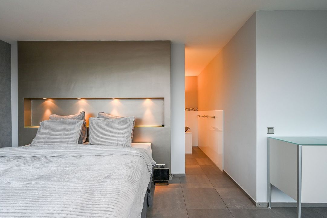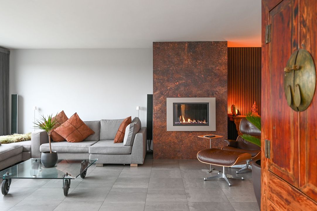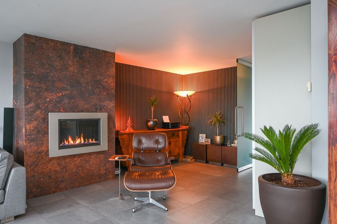 The living area features a Helex fireplace, creating a cozy atmosphere. From the living area, access to the first bedroom at the front, which features a custom-made wardrobe and air conditioning. The second bedroom (master bedroom) is flooded with natural light and provides access to the modern bathroom, which includes a bathtub, walk-in (rain) shower (Grohe), double washbasin (Sjartec), and faucets and accessories (Dornbacht).