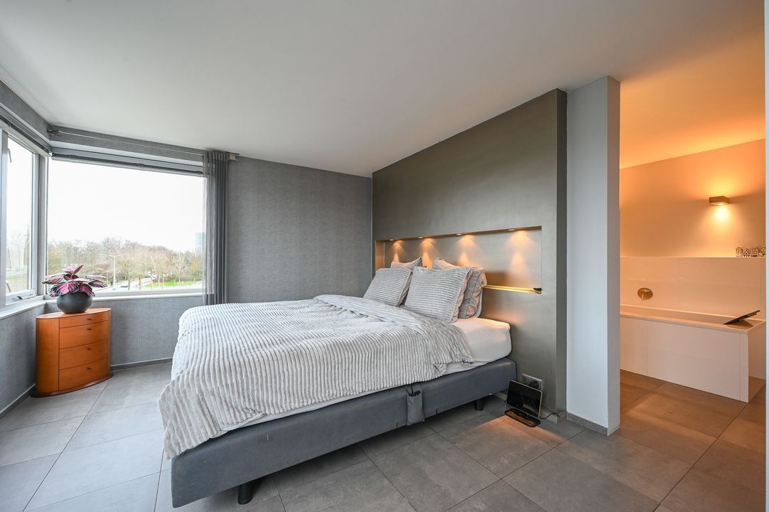Het zitgedeelte is voorzien van een sfeerbepalende openhaard van Helex. Vanuit het zitgedeelte toegang tot de 1e slaapkamer aan de voorzijde met een op maat gemaakte kastenwand en een airco-installatie, 2e slaapkamer (master bedroom) met veel lichtinval en toegang tot moderne badkamer voorzien van een ligbad, inloop(regen)douche (Grohe), dubbele wasbak (Sjartec), kranen en accesoires (Dornbacht)