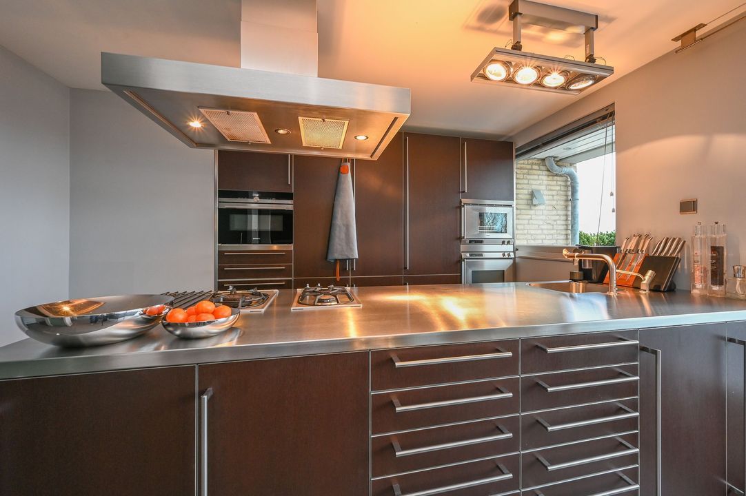Fraaie living met luxe open Bulthaup keuken in kleur Cacao voorzien van RVS-aanrechtblad met Quooker, 3-pits gasfornuis (Gaggenau), RVS-afzuigkap (Gutmann), diverse inbouwapparatuur zoals een oven met pyrolese functie, een stoomoven (Gaggenau), combi-oven, vaatwasser (Siemens), koel/vriescombinaties en veel opbergruimte.