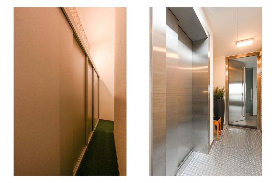 Enclosed main entrance with doorbells and mailboxes, video intercom system, stairs or elevator to the 3rd floor.