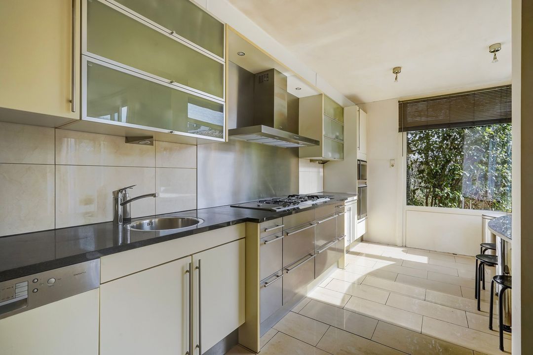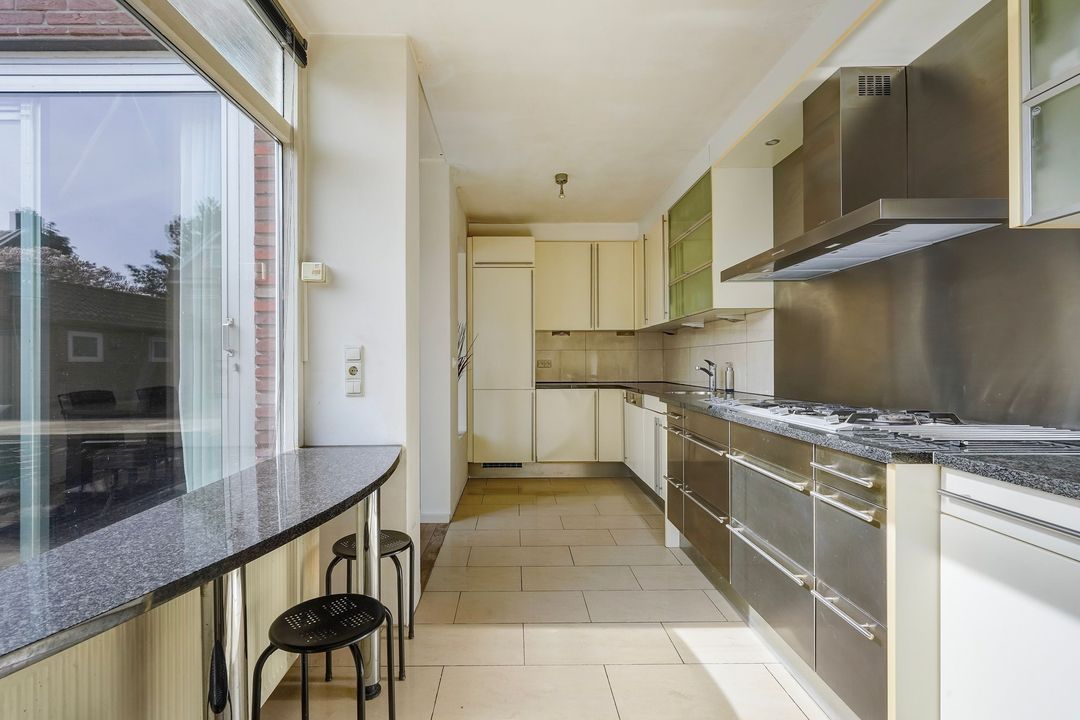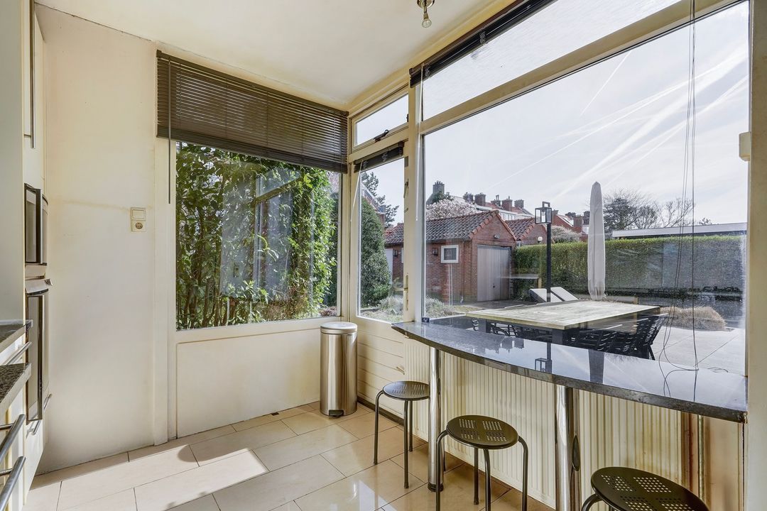 Entree, gang met houten lamellen parketvloer doorgelegd in de woonkamer, verdiepte trapkast, toilet met duoblok en fontein, openslaande deuren naar de lichte woon/eetkamer met voor- en zij erker, gas openhaard met zandstenen schouw en open doorgang naar de uitgebouwde keuken voorzien van natuurstenen aanrechtblad, 5 pits gasfornuis met frituur, vaatwasser, koel/vrieskast, close-in boiler, oven en magnetron. Vanuit de keuken/woonkamer toegang naar een schitterende tuin met stenen garage voorzien van elektrische kanteldeur, beregening en tuinverlichting installatie. De achtertuin is af te sluiten met een hoge schutting en op eigen terrein is er ruimte om 2 à 3 auto’s te parkeren.