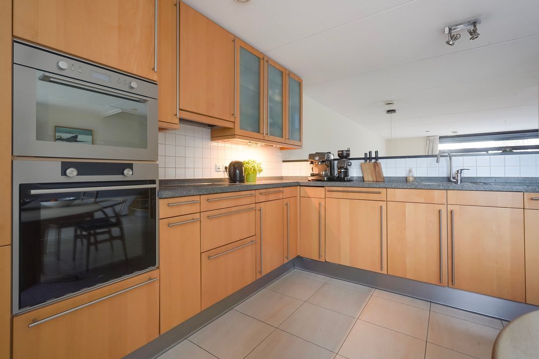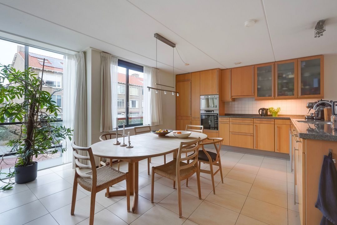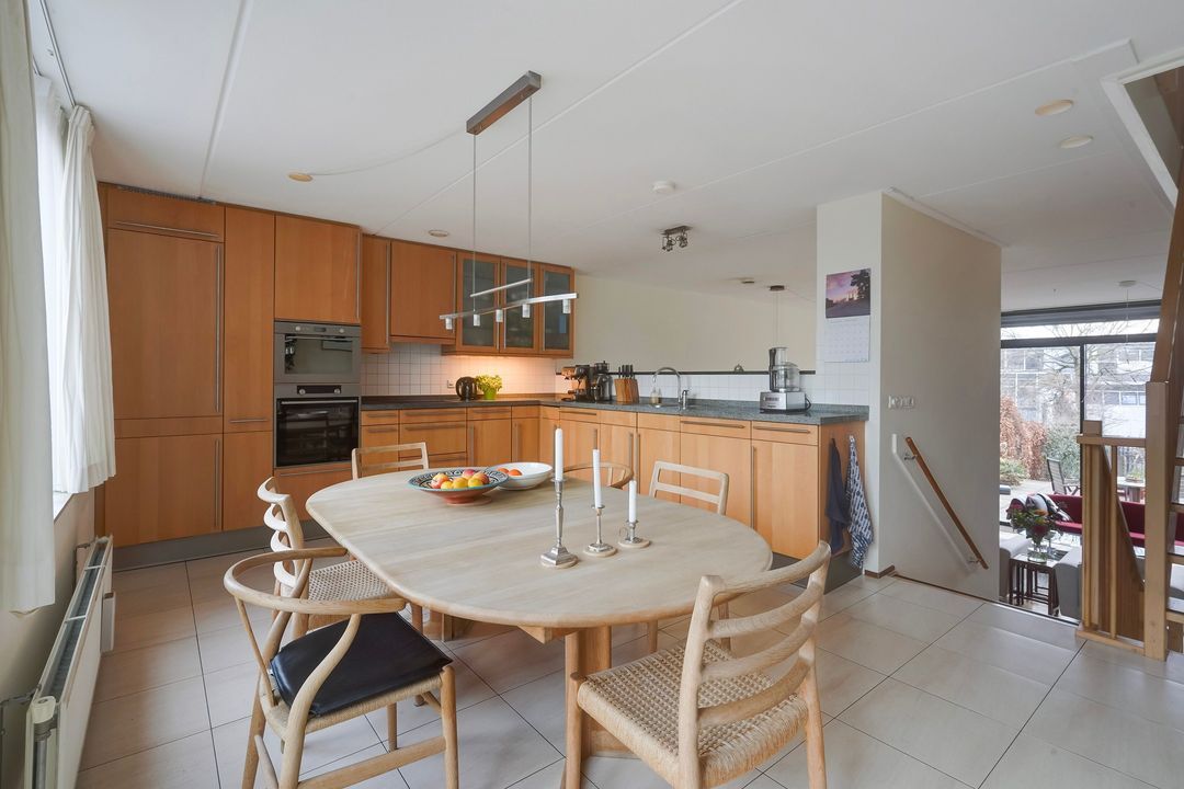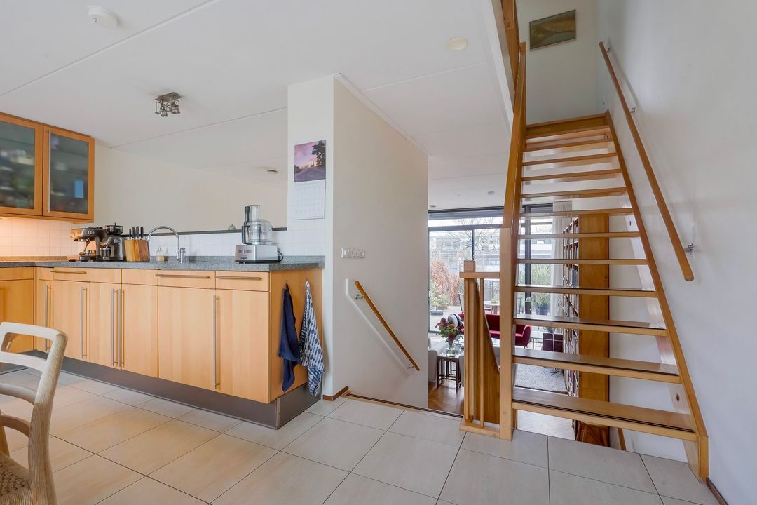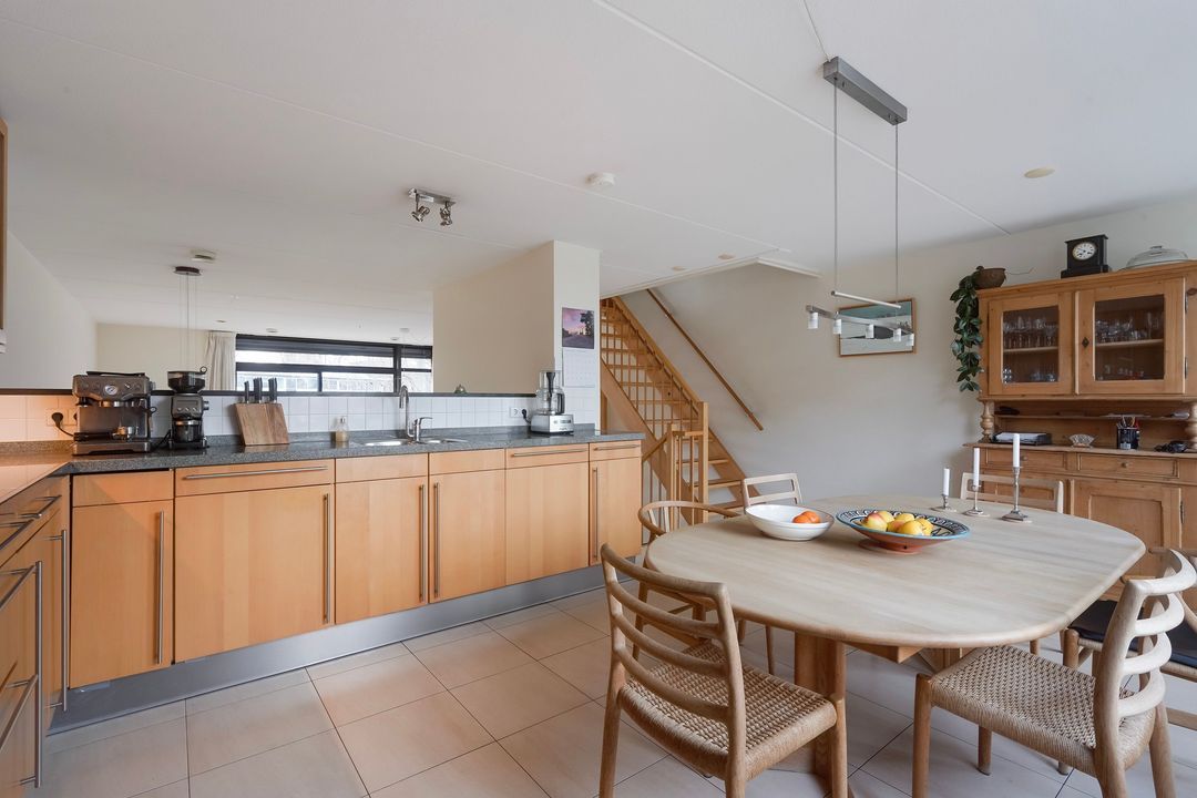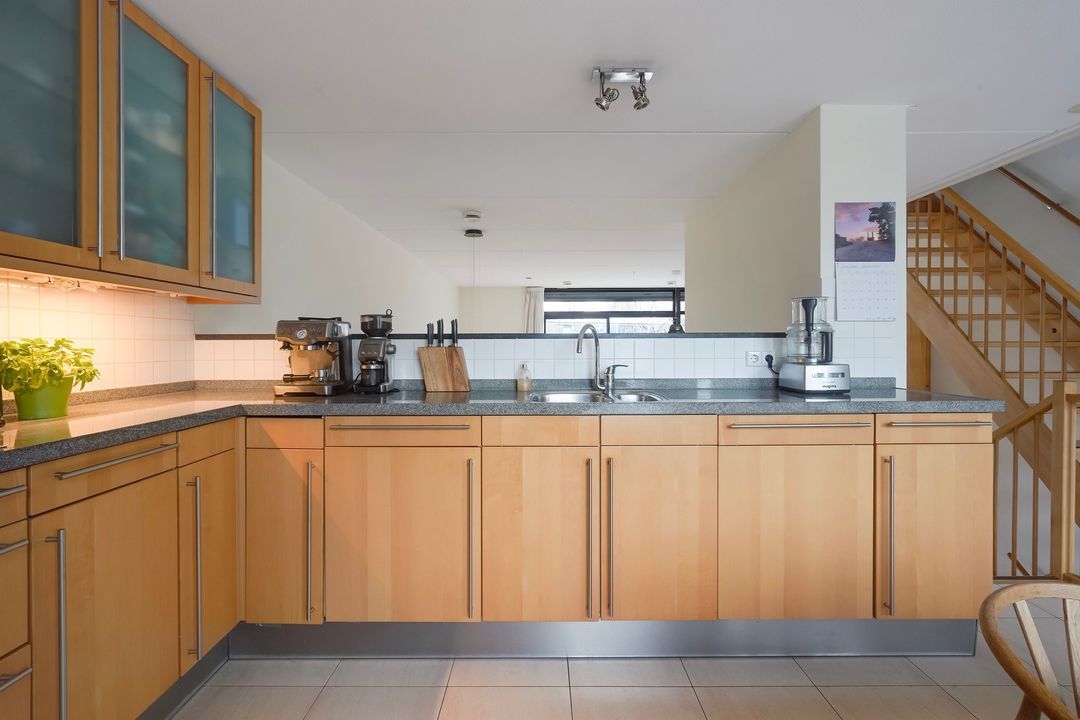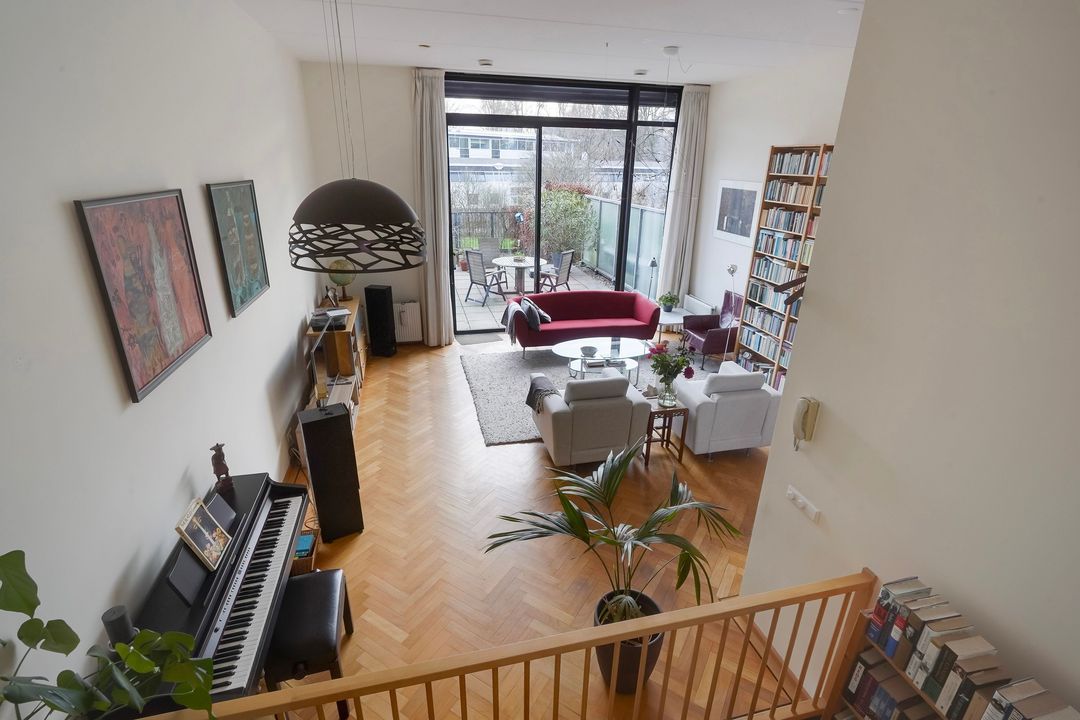 Aan de achterzijde gelegen heerlijke lichte woonkamer met hoge plafonds, fraaie visgraat parketvloer met bies, elektrische zonwering en schuifpui naar prachtige zonnige tuin met groot terras op het zuidoosten met achterom. Vanuit de woonkamer een trap naar de bovengelegen vide aan straatzijde met fraaie L-vormige keuken voorzien van diverse inbouwapparatuur, zoals keramische kookplaat, afzuigkap, oven, magnetron, koel/vriescombinatie en 1,5 spoelbak. Vanuit de keuken een fraai vrij uitzicht naar de Akkerwindestraat.