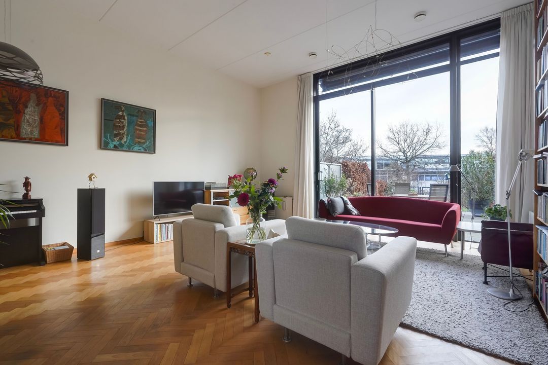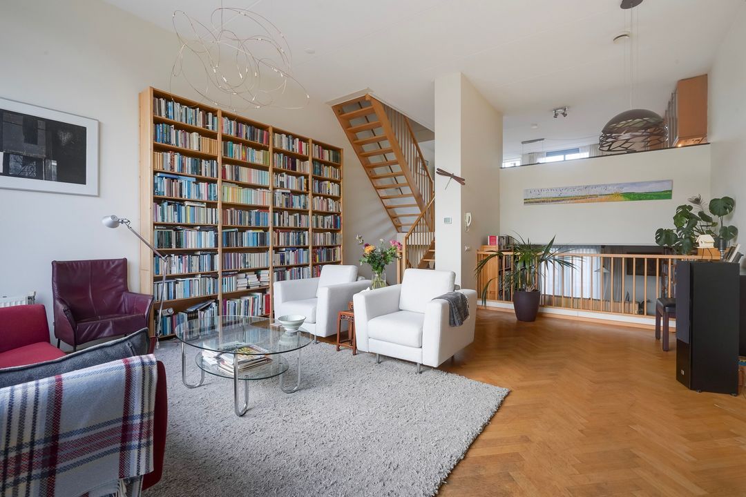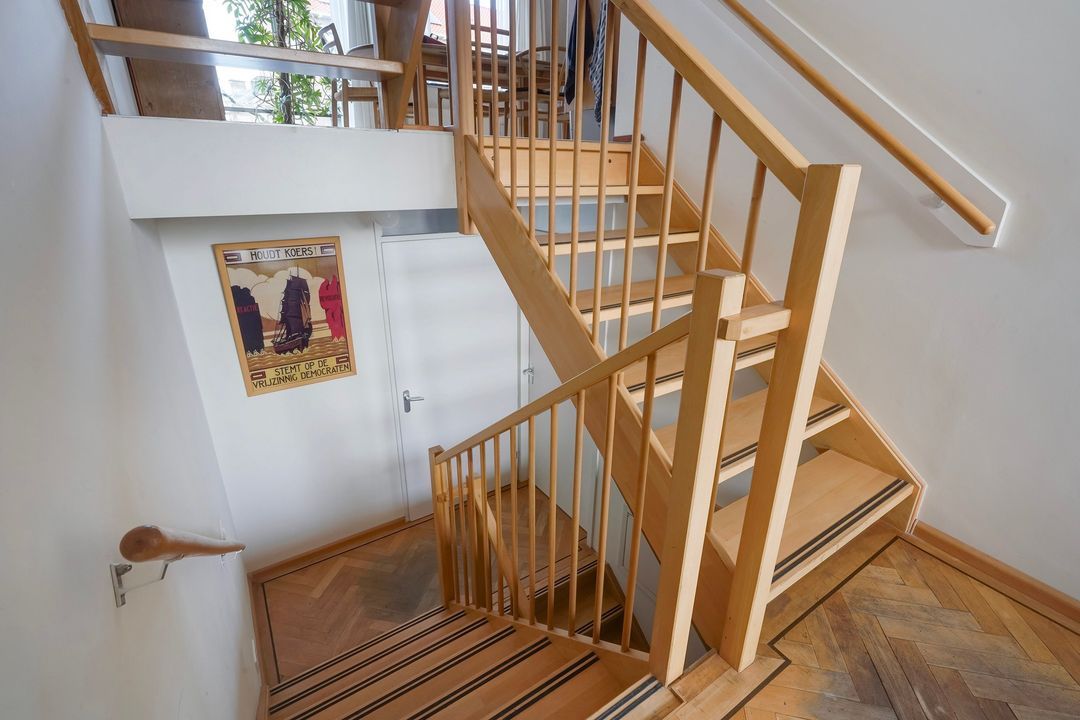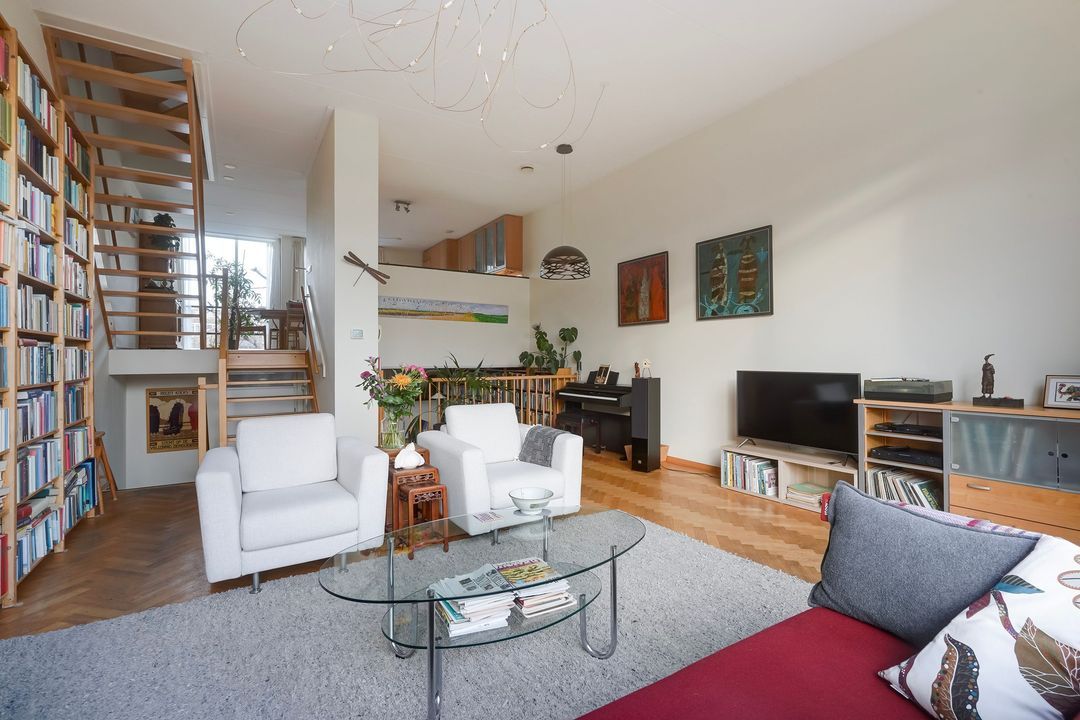 Located at the rear of the house is a lovely, bright living room with high ceilings, beautiful herringbone parquet flooring with a border, electric sun blinds, and sliding doors leading to a beautiful, sunny garden with a large southeast-facing terrace and rear access. Stairs from the living room leads to the upstairs loft on the street side, which features a beautiful L-shaped kitchen equipped with various built-in appliances, including a ceramic hob, extractor hood, oven, microwave, fridge/freezer and a 1.5-basin sink. From the kitchen a beautiful unobstructed view of the Akkerwindestraat.