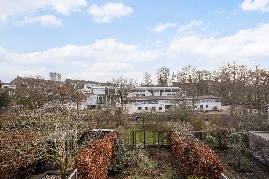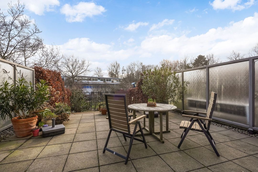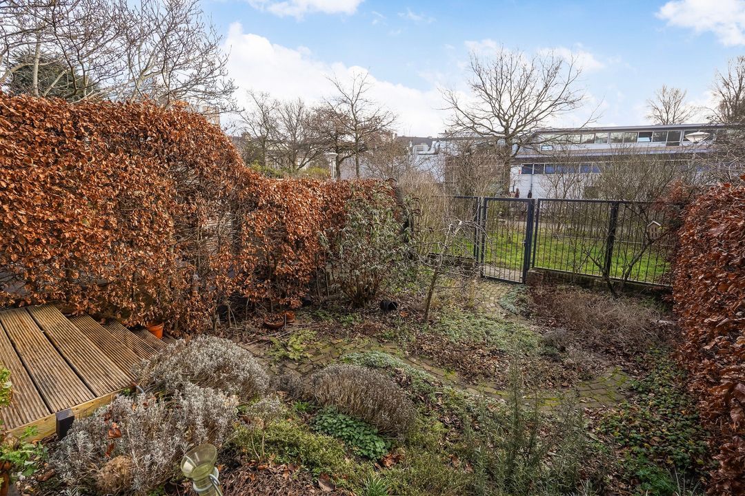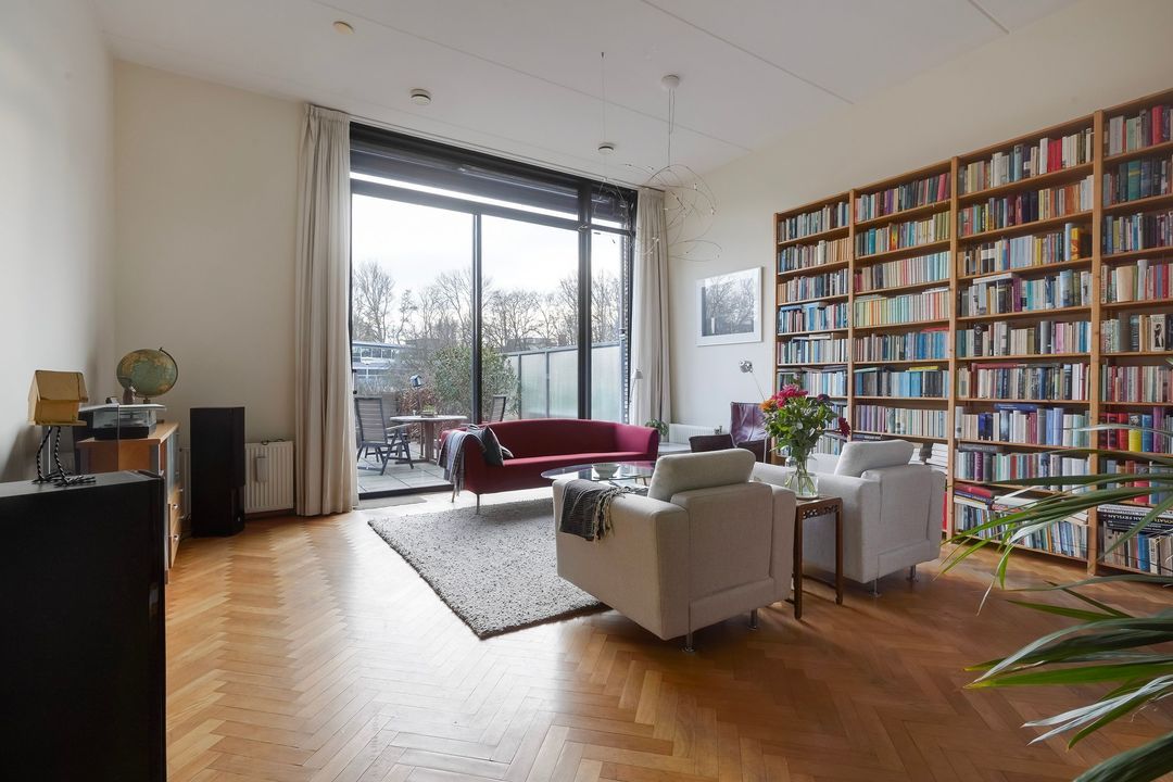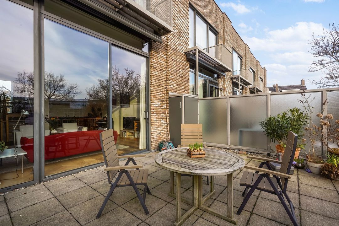 Located at the rear of the house is a lovely, bright living room with high ceilings, beautiful herringbone parquet flooring with a border, electric sun blinds, and sliding doors leading to a beautiful, sunny garden with a large southeast-facing terrace and rear access. Stairs from the living room leads to the upstairs loft on the street side, which features a beautiful L-shaped kitchen equipped with various built-in appliances, including a ceramic hob, extractor hood, oven, microwave, fridge/freezer and a 1.5-basin sink. From the kitchen a beautiful unobstructed view of the Akkerwindestraat.