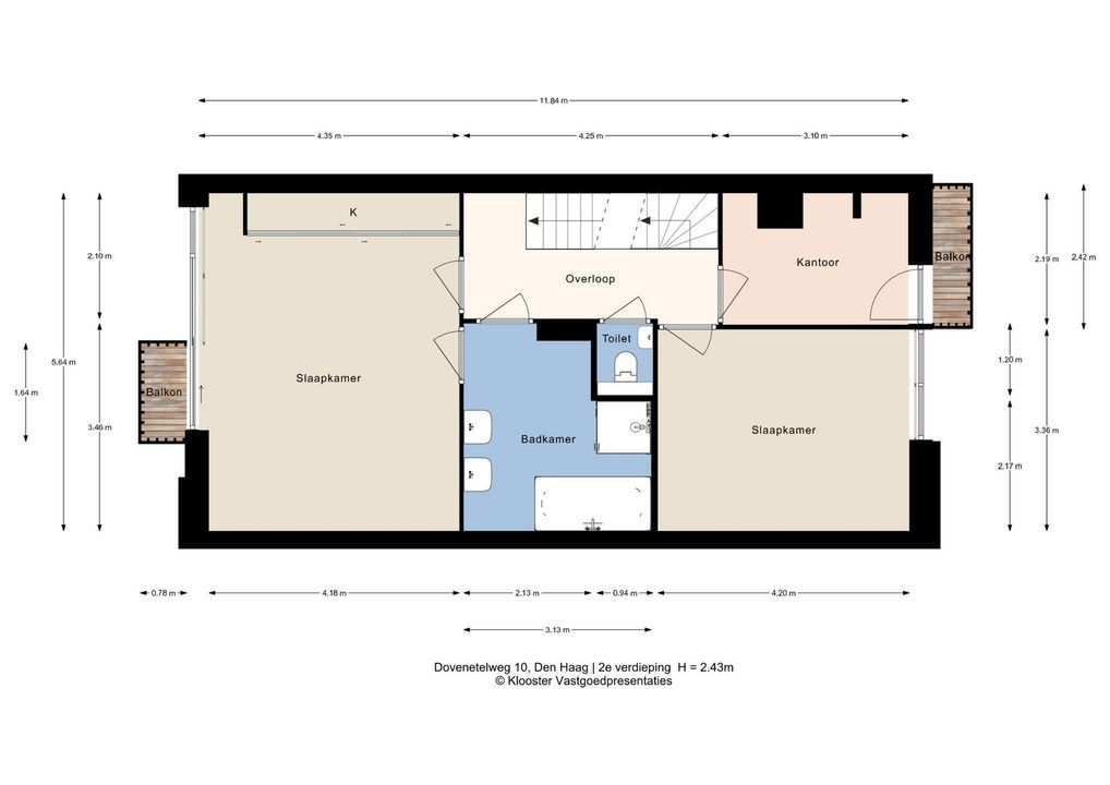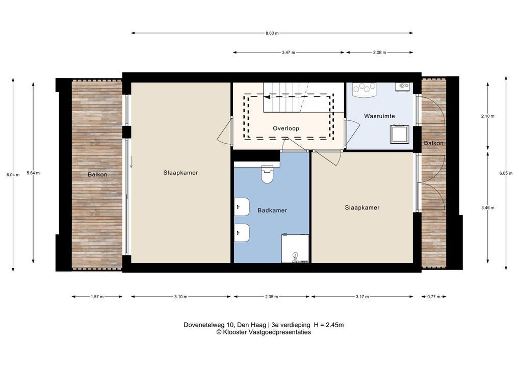 Landing with skylight, second spacious bathroom with a shower, two washbasins, a toilet, and a heated towel rail. The rear bedroom features new sliding doors with sun blinds leading to a sunny southeast-facing balcony. The front bedroom with a door to the northwest-facing balcony. The laundry room includes connections for a washing machine and dryer and houses the central heating boiler with a hybrid heat pump, solar panel inverter, and heat recovery unit.