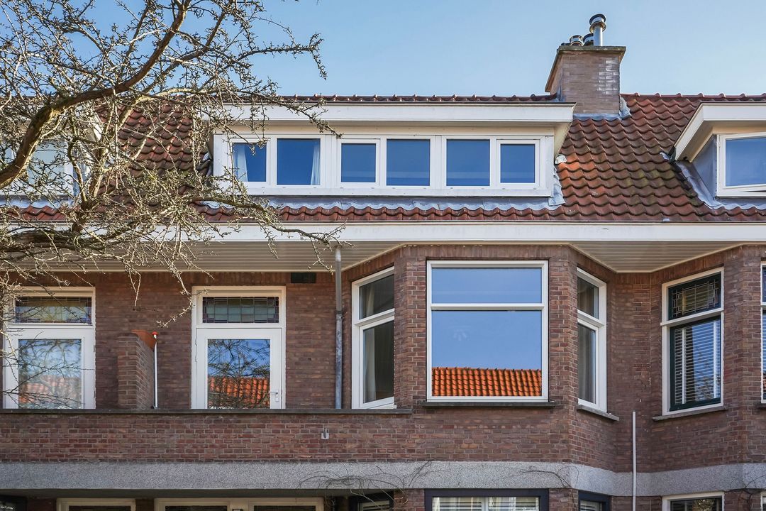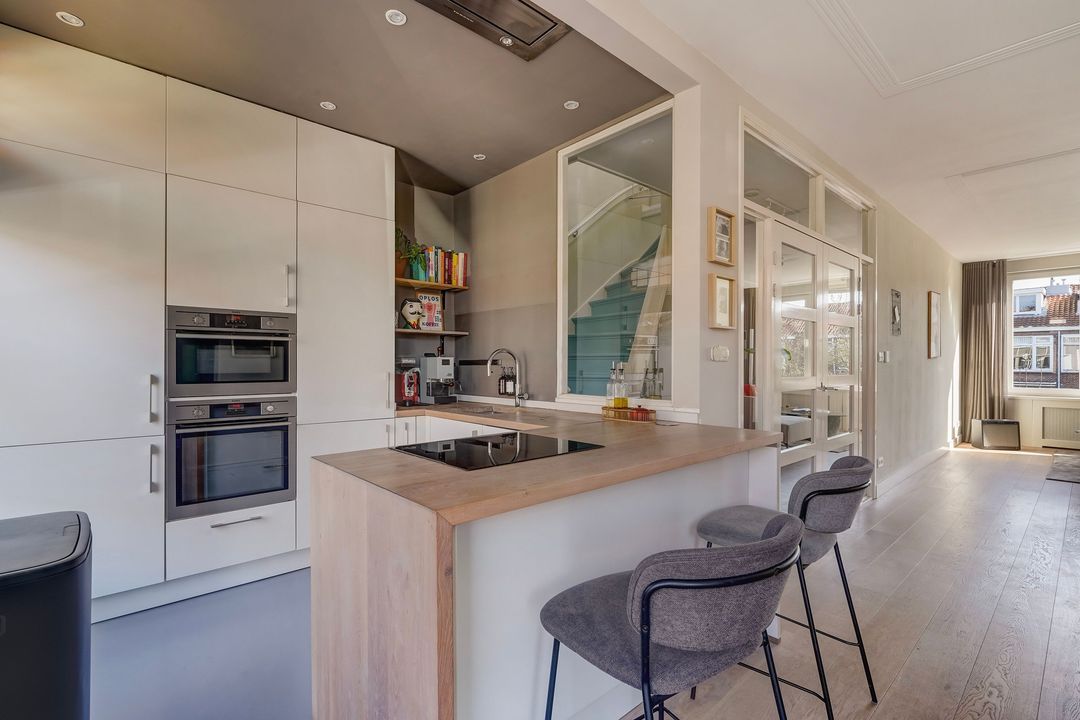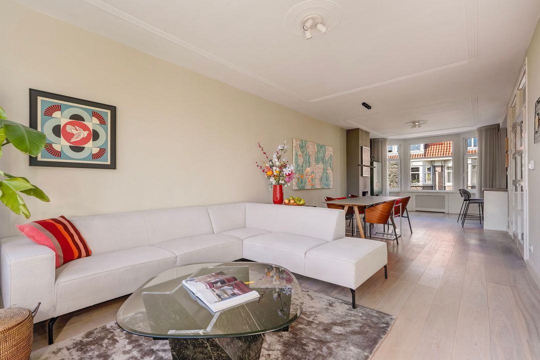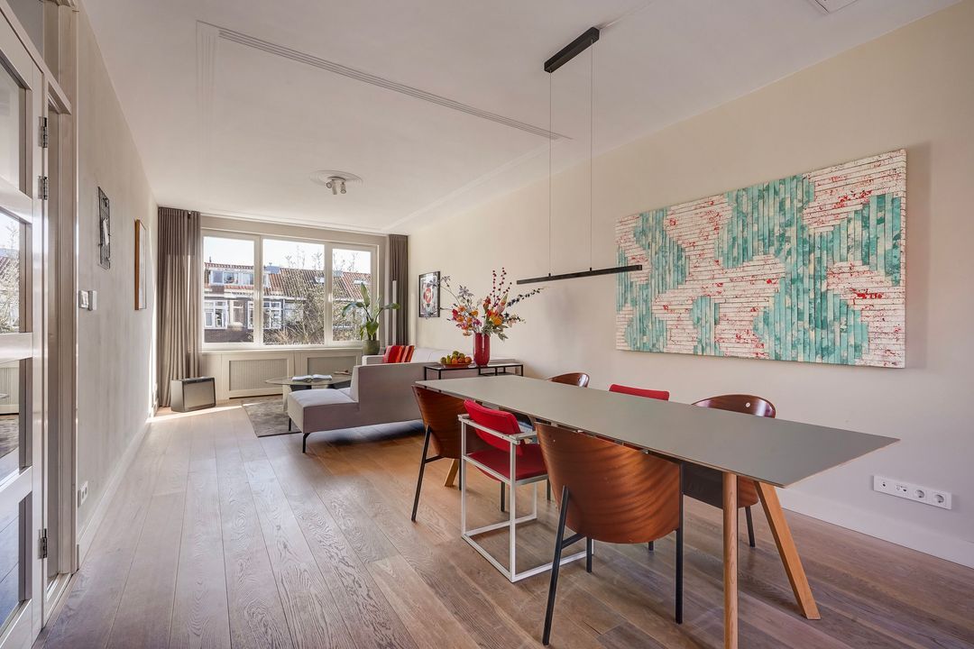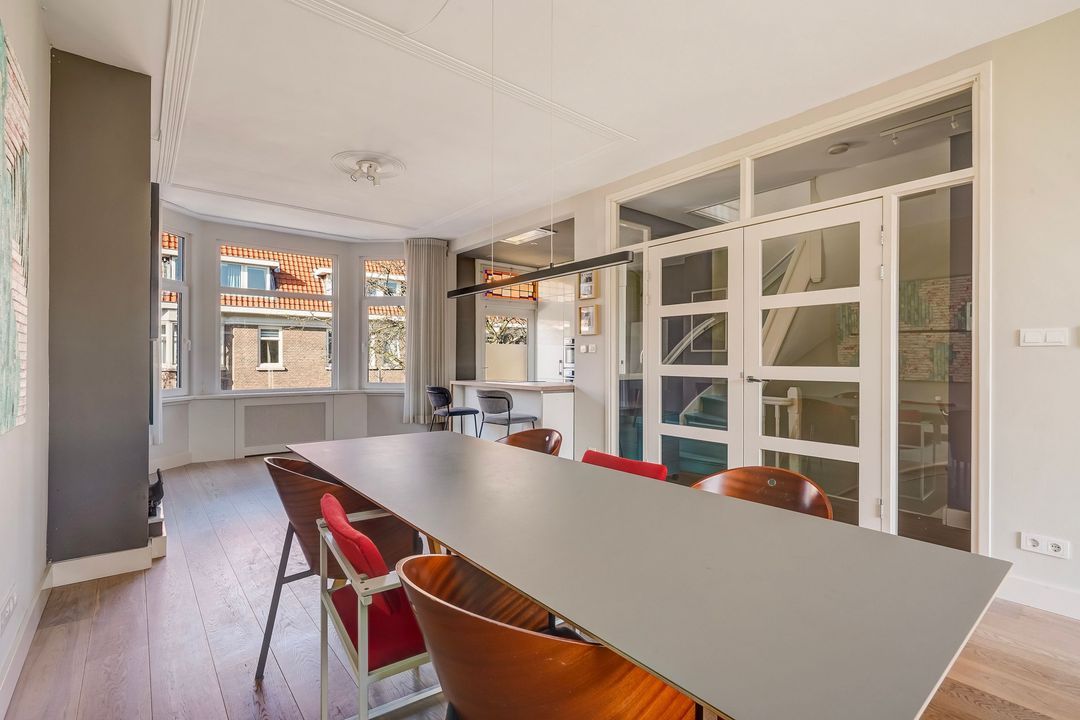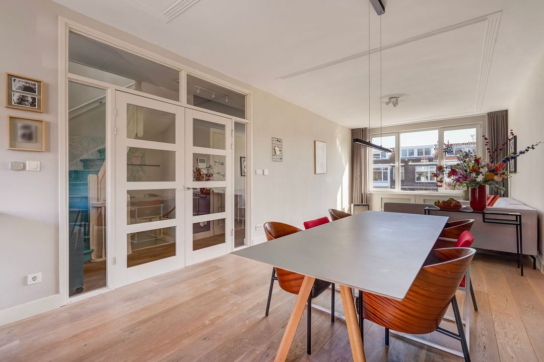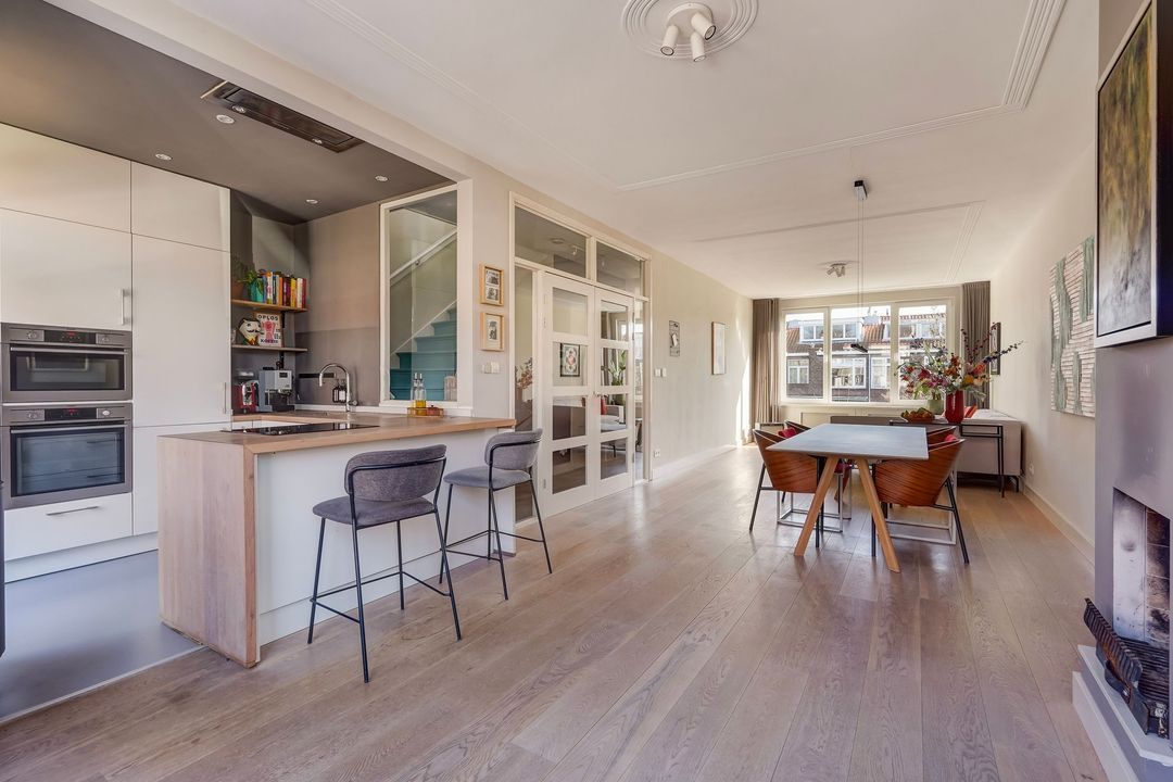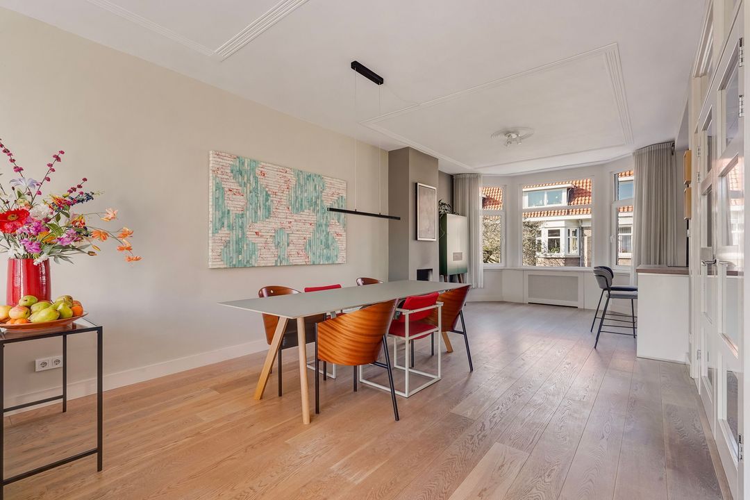Situated in one of the most charming streets in the Vruchtenbuurt neighborhood, this beautifully modernized, spacious 6-room duplex apartment (approx. 111 m² living area) dates back to the 1930s and features a charming living/dining room with an open-plan kitchen, four bedrooms, a balcony, and a lovely sunny southeast-facing roof terrace.
