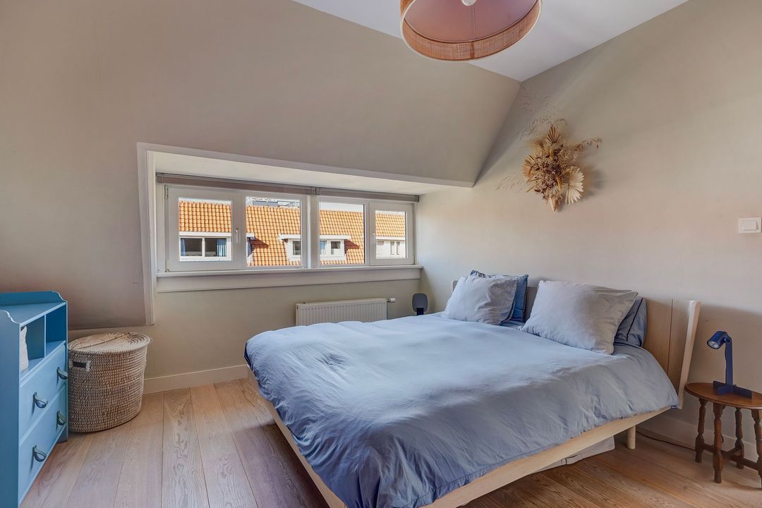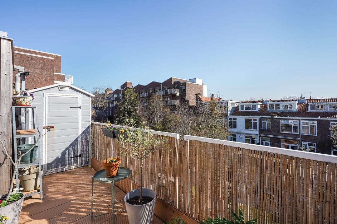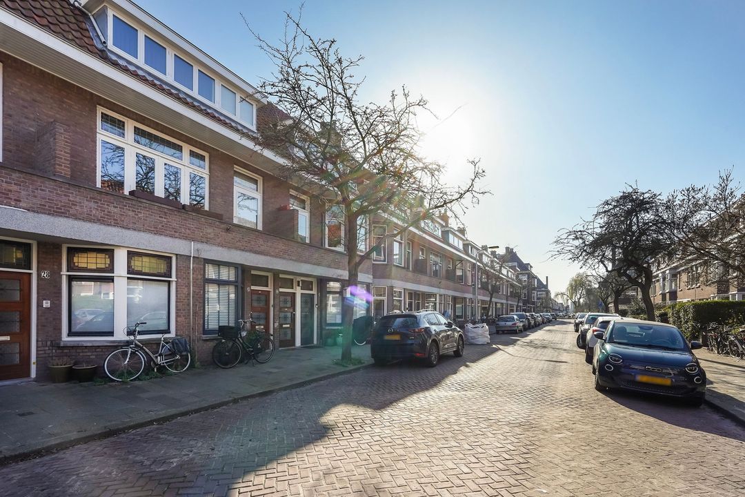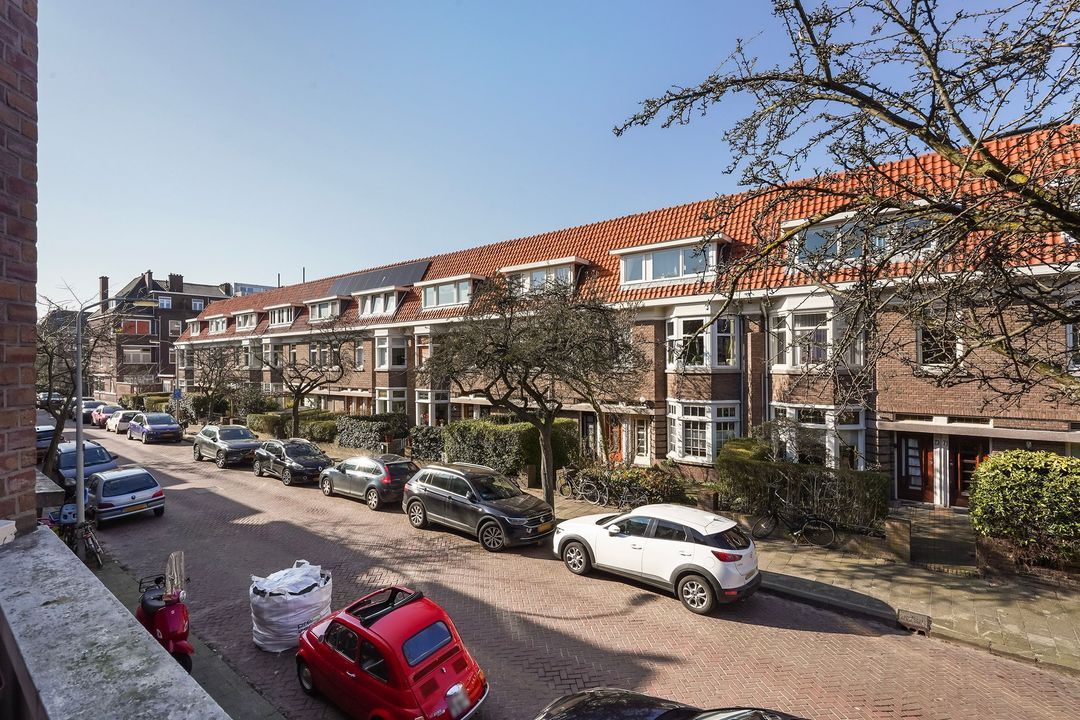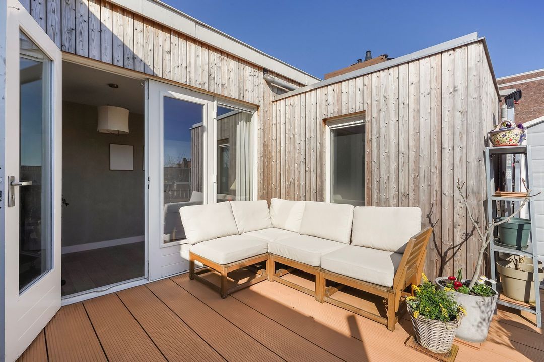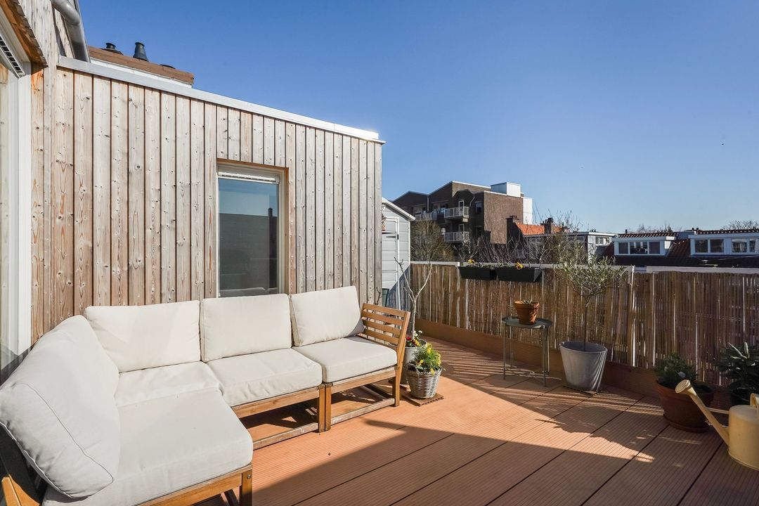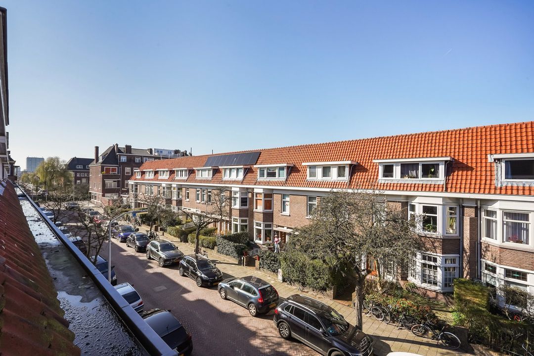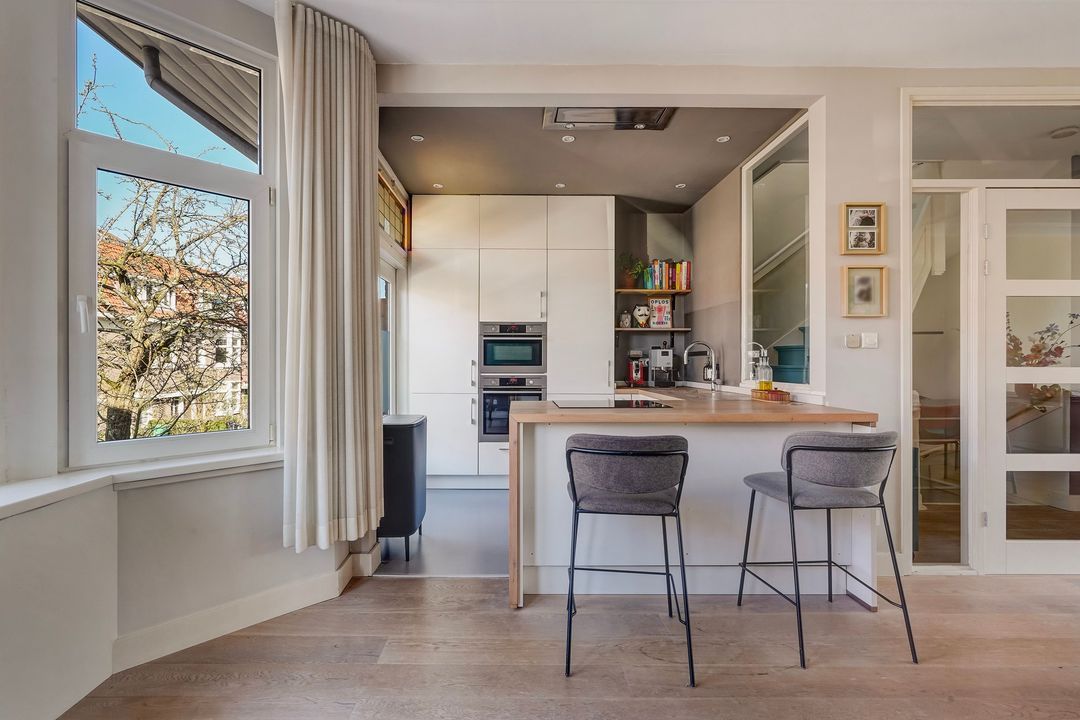 Situated in one of the most charming streets in the Vruchtenbuurt neighborhood, this beautifully modernized, spacious 6-room duplex apartment (approx. 111 m² living area) dates back to the 1930s and features a charming living/dining room with an open-plan kitchen, four bedrooms, a balcony, and a lovely sunny southeast-facing roof terrace.