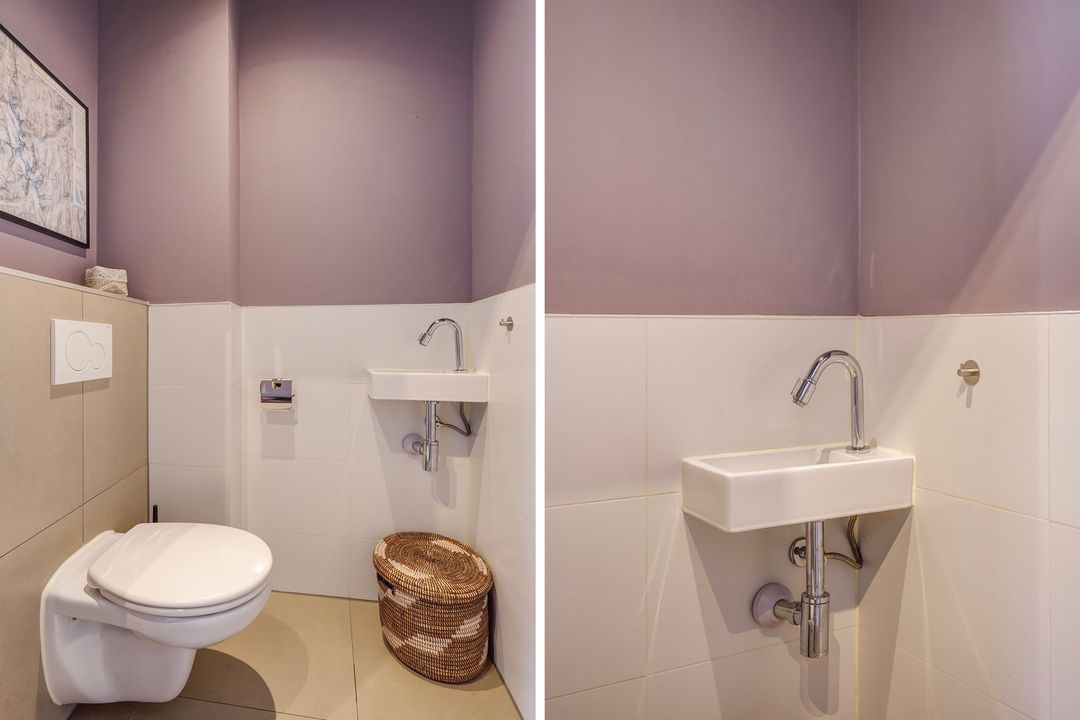 Entree van het appartement, hal, trap naar de 1e verdieping, overloop voorzien van fraaie lamel parketvloer doorgelegd op beide verdiepingen en modern toilet met fontein.