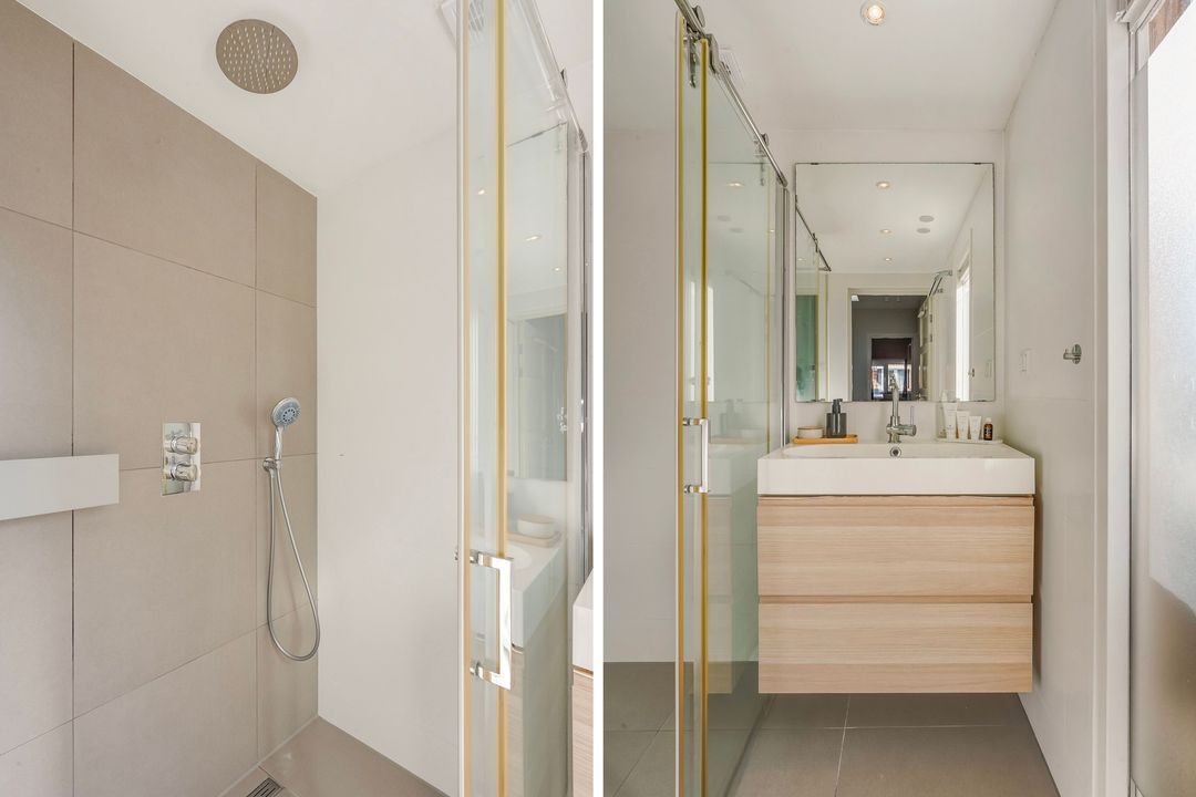 Moderne badkamer voorzien van inloopdouche, wastafelmeubel, vloerverwarming en mechanische ventilatie.