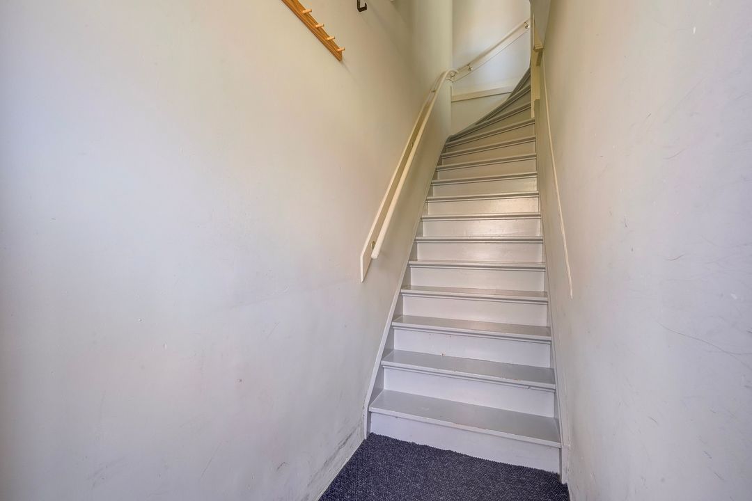 Rear bedroom with a door to the balcony with overhang and storage cupboard.