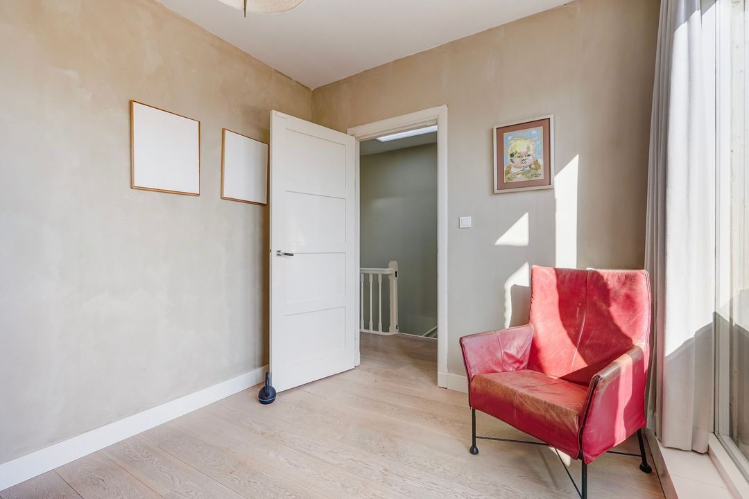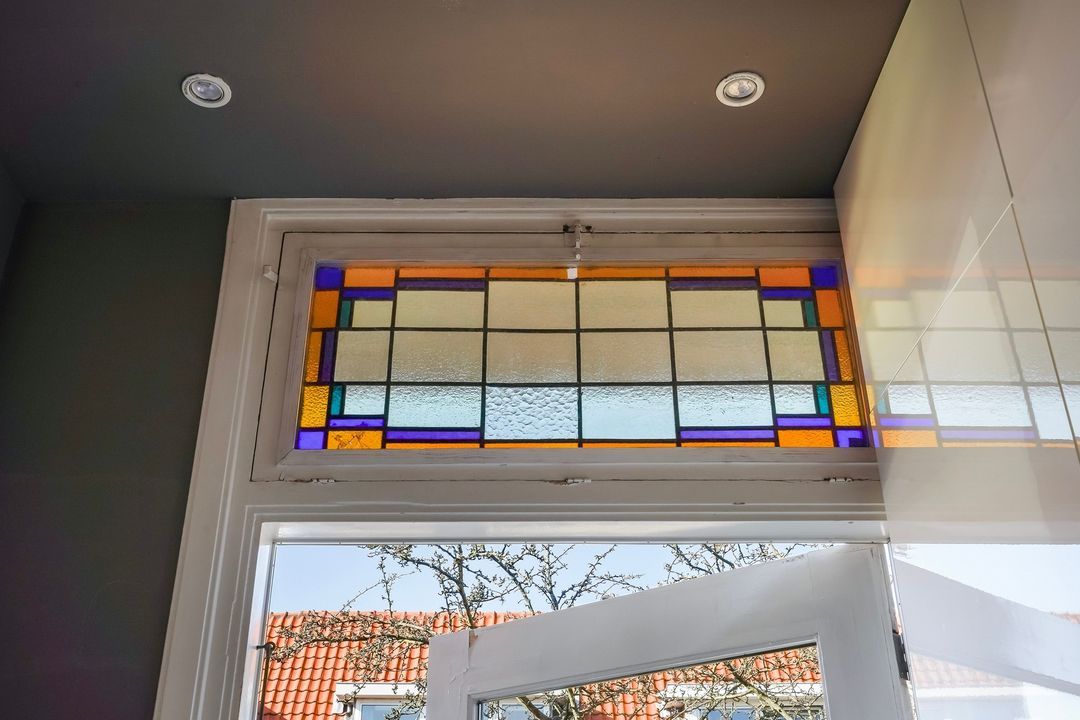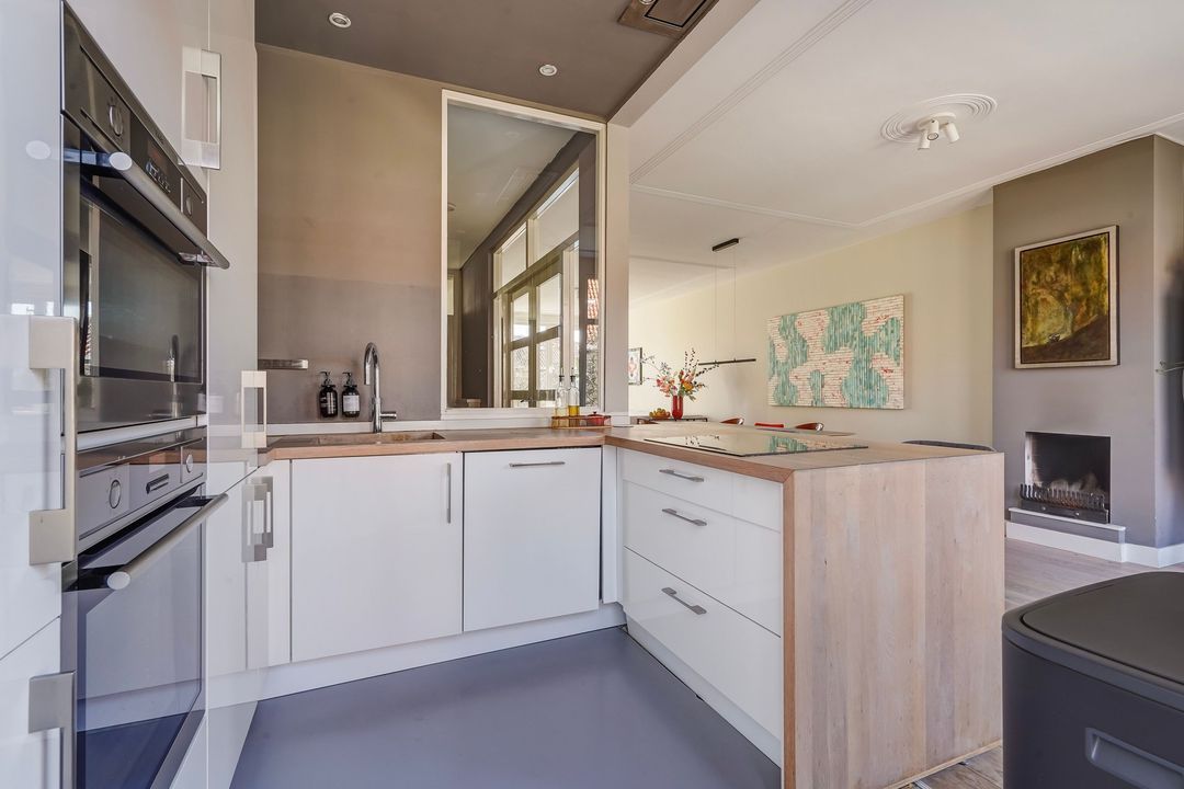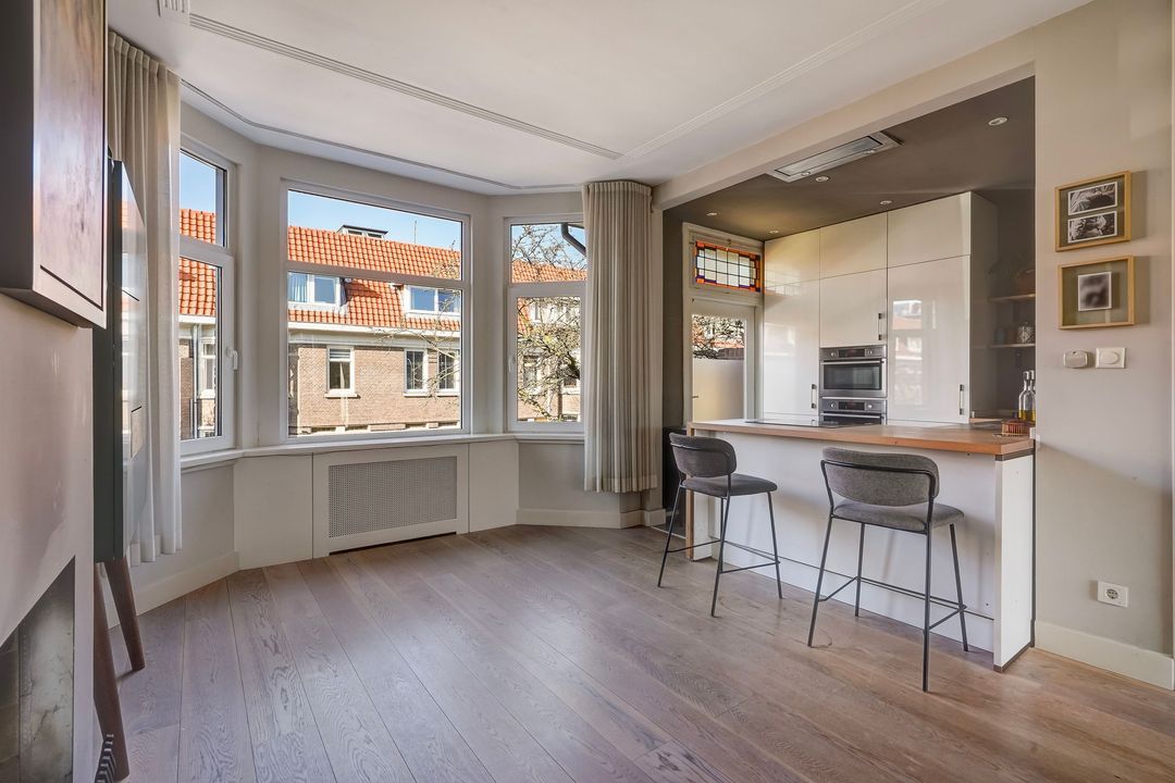 Charming, bright living/dining room with a fireplace and a bay window at the front. Open-plan kitchen equipped with various built-in appliances, including a induction hob, fridge/freezer, combination oven/microwave, oven, dishwasher, Quooker, extractor hood, and a stained-glass skylight leading to the northwest-facing balcony.