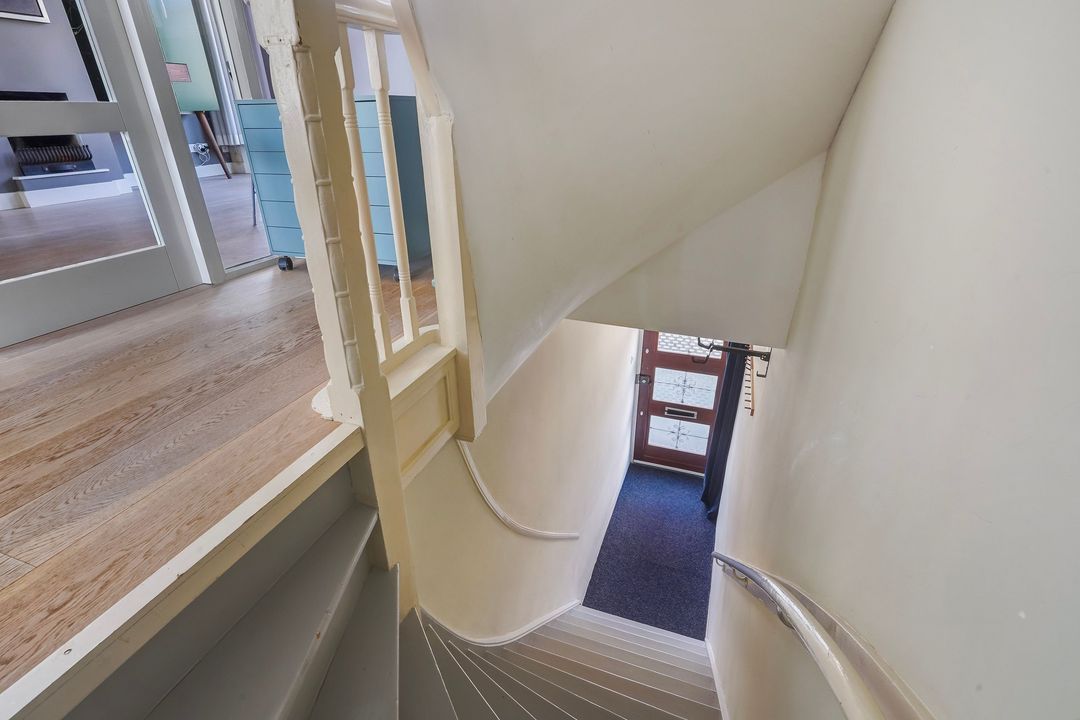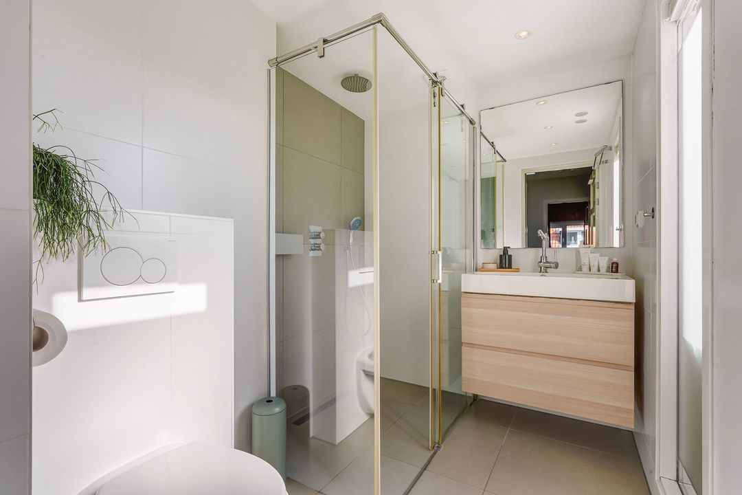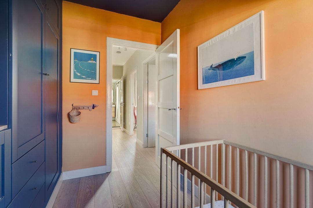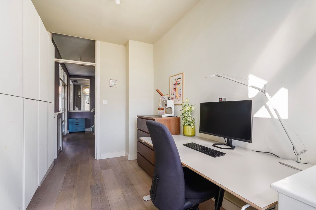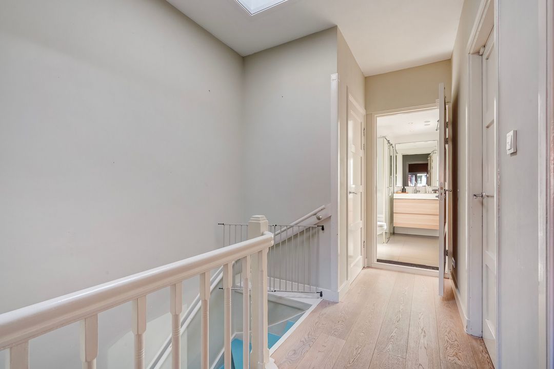 Charming, bright living/dining room with a fireplace and a bay window at the front. Open-plan kitchen equipped with various built-in appliances, including a induction hob, fridge/freezer, combination oven/microwave, oven, dishwasher, Quooker, extractor hood, and a stained-glass skylight leading to the northwest-facing balcony.