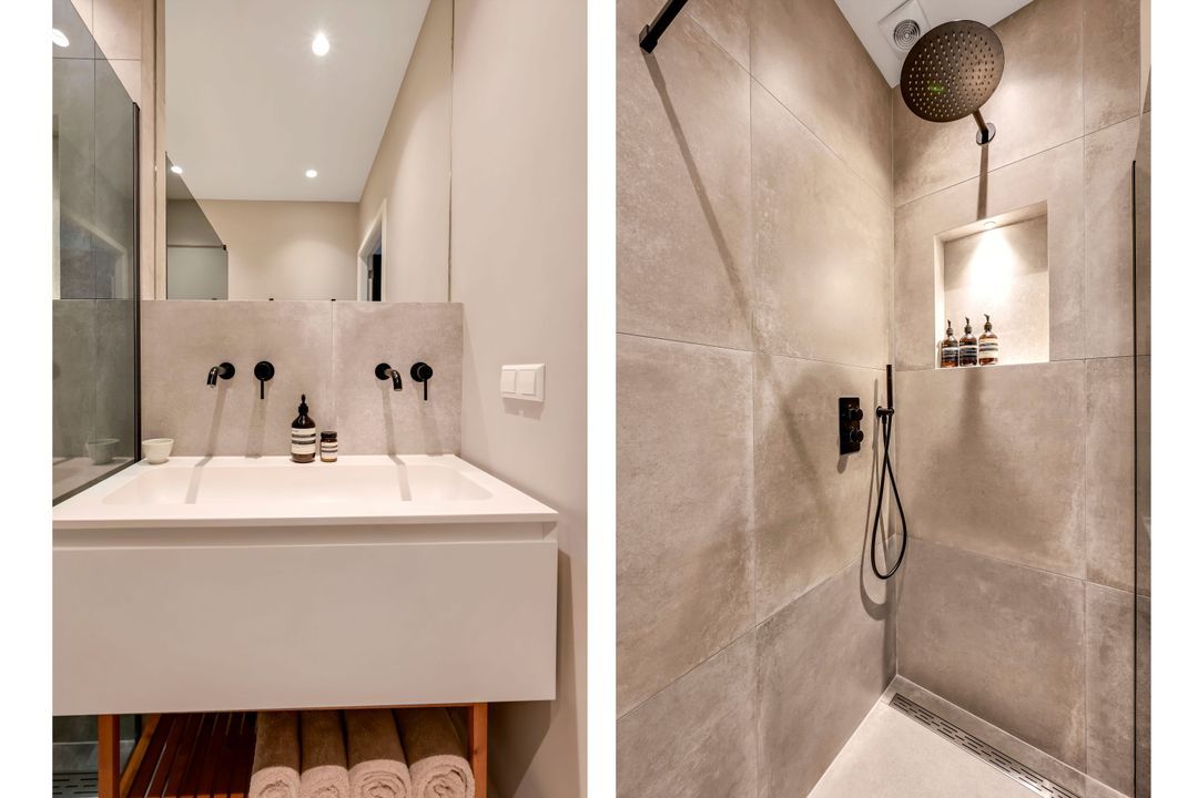 Moderne badkamer voorzien van inloopdouche, dubbel wastafelmeubel, vloerverwarming en design radiator.