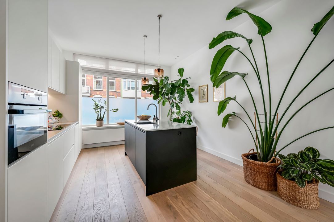 Via hoge stalen openslaande deuren toegang naar de riante woonkamer met aan de voorzijde een luxe open keuken voorzien van diverse inbouwapparatuur, zoals inductiekookplaat met geïntegreerde afzuiging (merk Bora), vaatwasser, koel-/ vriescombinatie en combi oven/magnetron.