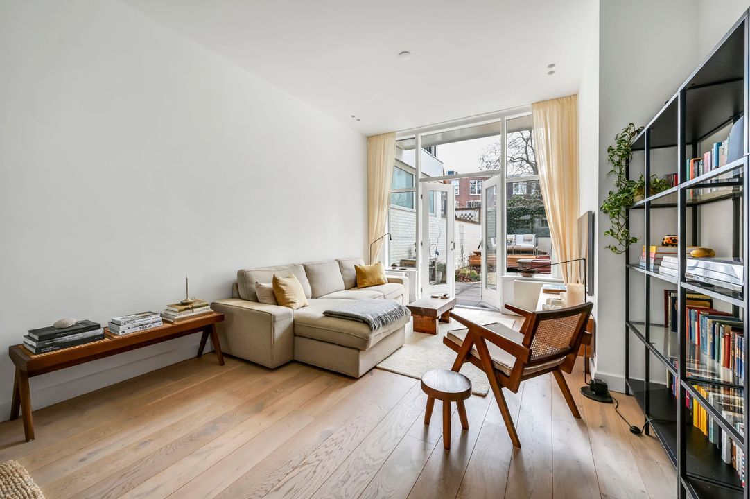 High steel French doors lead into the spacious living room, with a luxurious open-plan kitchen at the front, equipped with various built-in appliances, including a Bora induction cooktop with integrated extractor fan, dishwasher, fridge/freezer, and combination oven/microwave.