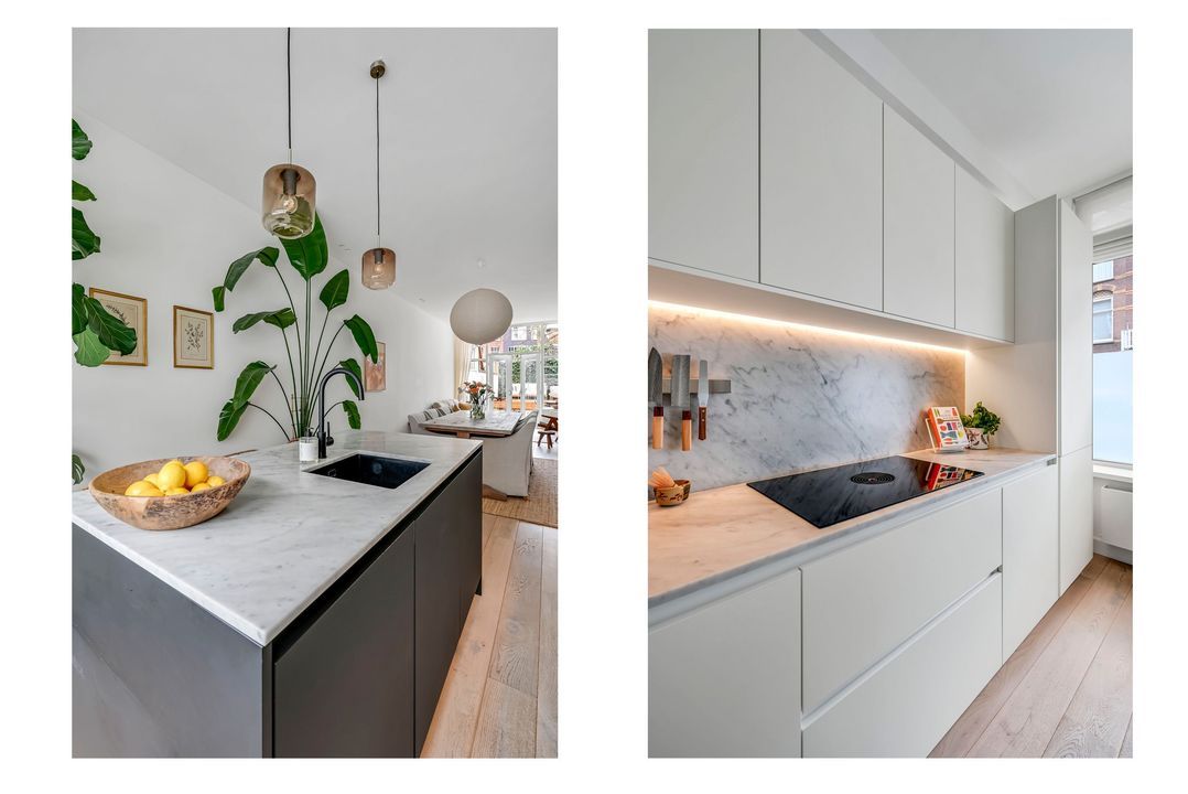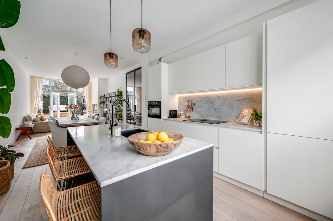 Via hoge stalen openslaande deuren toegang naar de riante woonkamer met aan de voorzijde een luxe open keuken voorzien van diverse inbouwapparatuur, zoals inductiekookplaat met geïntegreerde afzuiging (merk Bora), vaatwasser, koel-/ vriescombinatie en combi oven/magnetron.